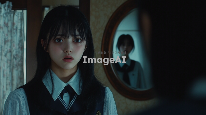집 현관 거울 앞에서 한국 교복을 입은 검은 머리의 한국 여고생이 혼란스러운 표정으로 두려움에 떨며 거울을 바라보고 있다. 그녀의 친구 모습이 거울에 비쳐 나타나고, 어두운 조명 속에서 긴장감이 감도는 장면.