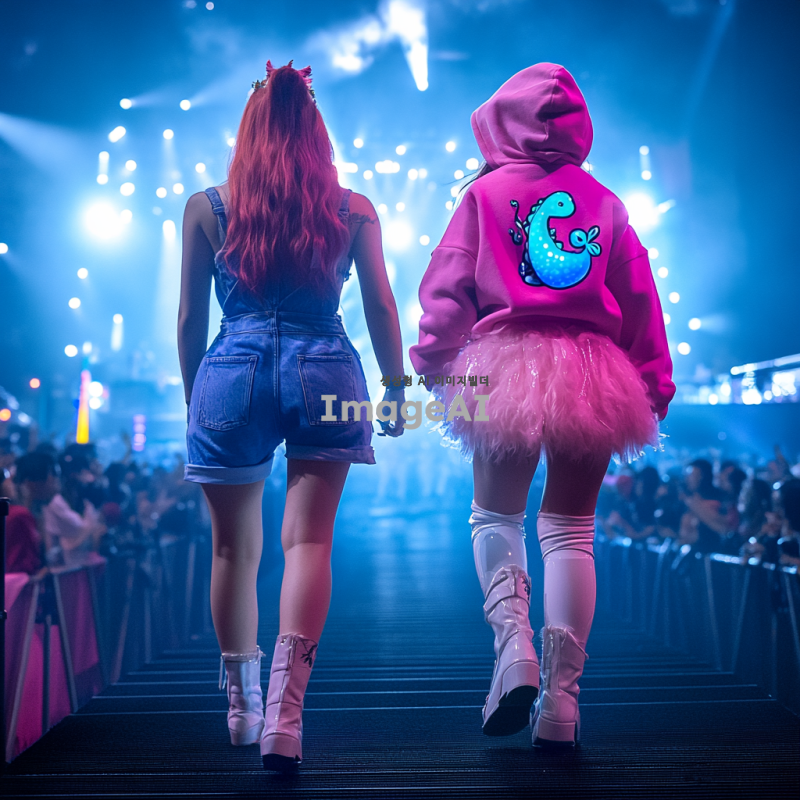 두 여자중 왼쪽 여자는 빨간 긴생머리에 파란색 멜빵바지를 입고있고 오른쪽 여자는 분홍색 오버핏 해마후드를 쓰고있고 분홍치마에 흰색 장화를 신고 있다 이 두여자의 뒷모습으로 눈부신 무대위를 걸어서 올라가는중이다.