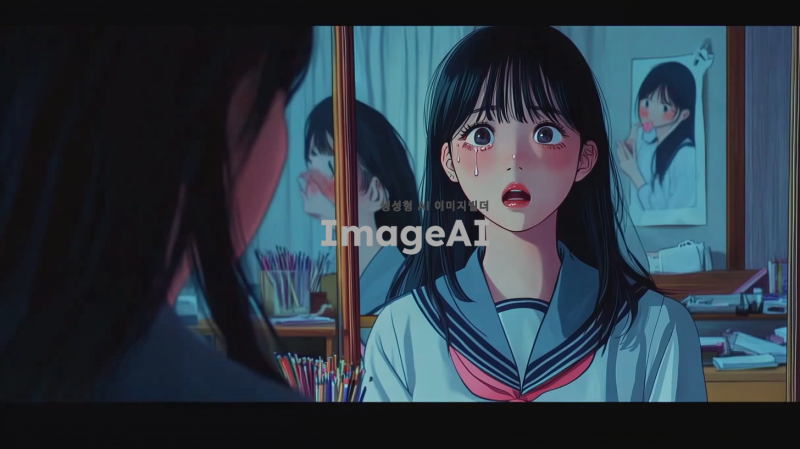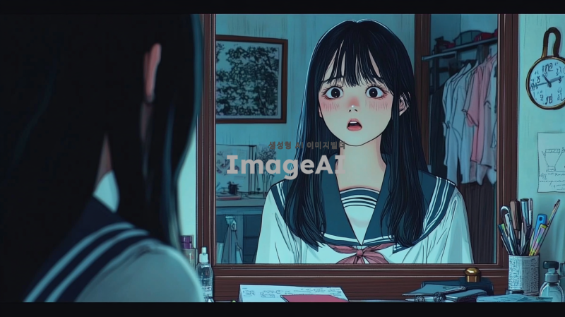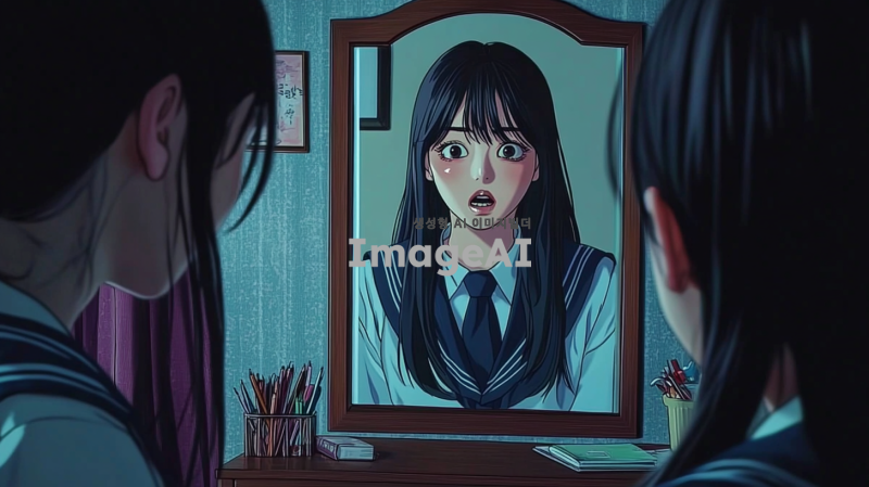 한국 여고생의 방 안, 화장대 앞에서 한국 교복을 입은 검은 머리의 여고생이 혼란스러운 표정으로 두려움에 떨며 거울을 바라보고 있다. 거울에 비친 그녀의 친구는 슬픈 표정으로 여고생을 바라보고 있으며, 여고생은 눈물을 흘리며 거울에 비친 친구에게 인사하고 있다. 방은 아늑하지만 긴장감이 감도는 분위기로, 주변에는 학용품과 책들이 흩어져 있다.
