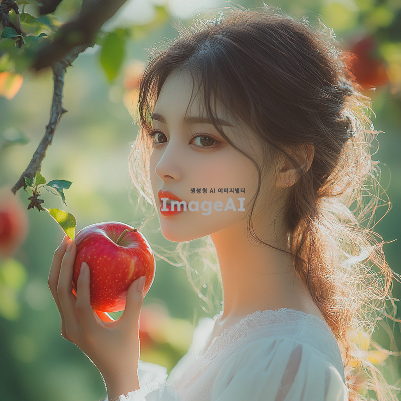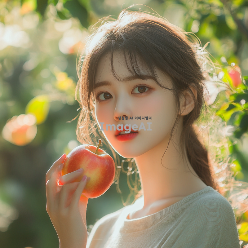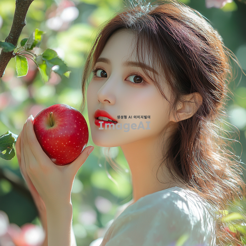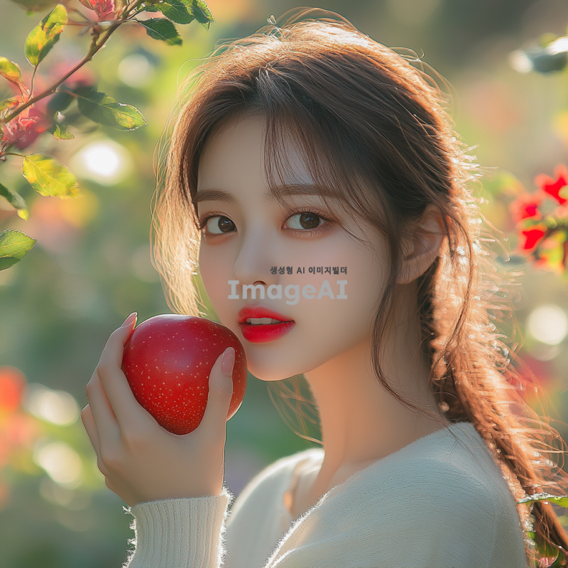 예쁜 한국 여성 모델이 자연 속에서 사과를 들고 먹으려는 모습. 푸른 나무와 화사한 꽃들이 배경에 어우러져 있고, 햇살이 부드럽게 비치는 따뜻한 분위기. 여성의 표정은 즐거움과 호기심이 가득하며, 사과의 붉은 색깔이 돋보이도록. 자연의 신선한 느낌과 함께 여유로운 순간을 담아낸 장면.