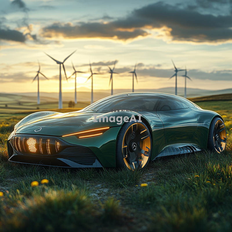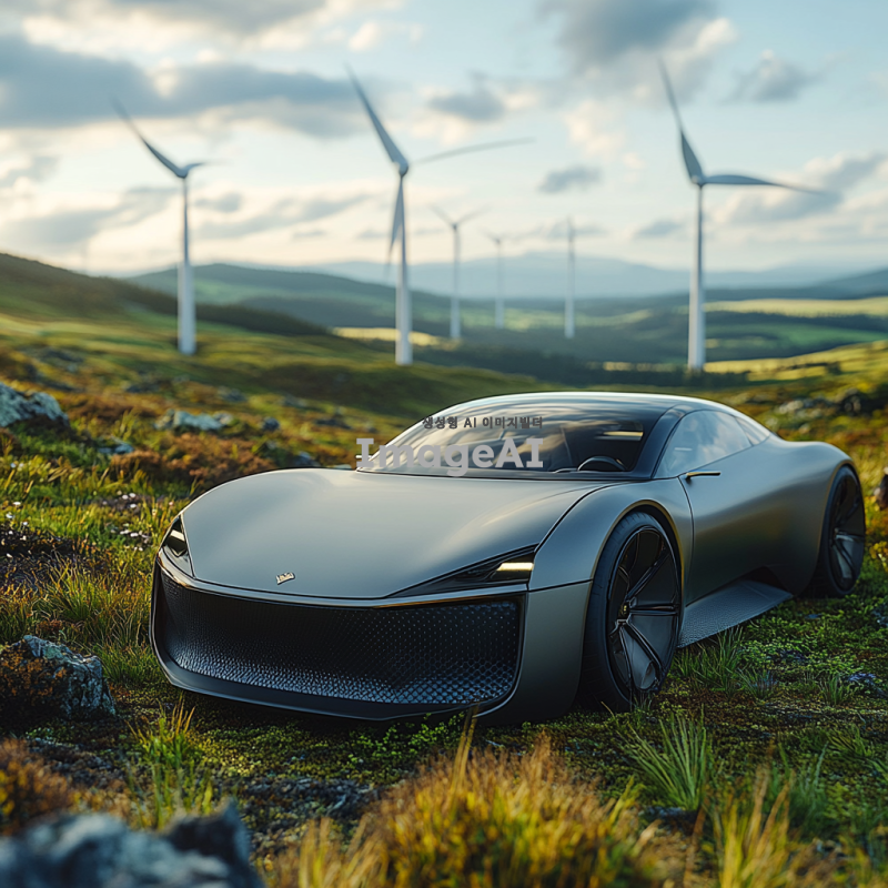 푸른 들판 위에 서 있는 현대적인 풍력자동차, 바람에 의해 회전하는 풍력 터빈들이 배경에 위치하고, 맑은 하늘과 구름이 어우러진 풍경, 자동차는 미래적인 디자인으로, 자연과 조화를 이루는 모습, 햇살이 비추는 따뜻한 분위기.