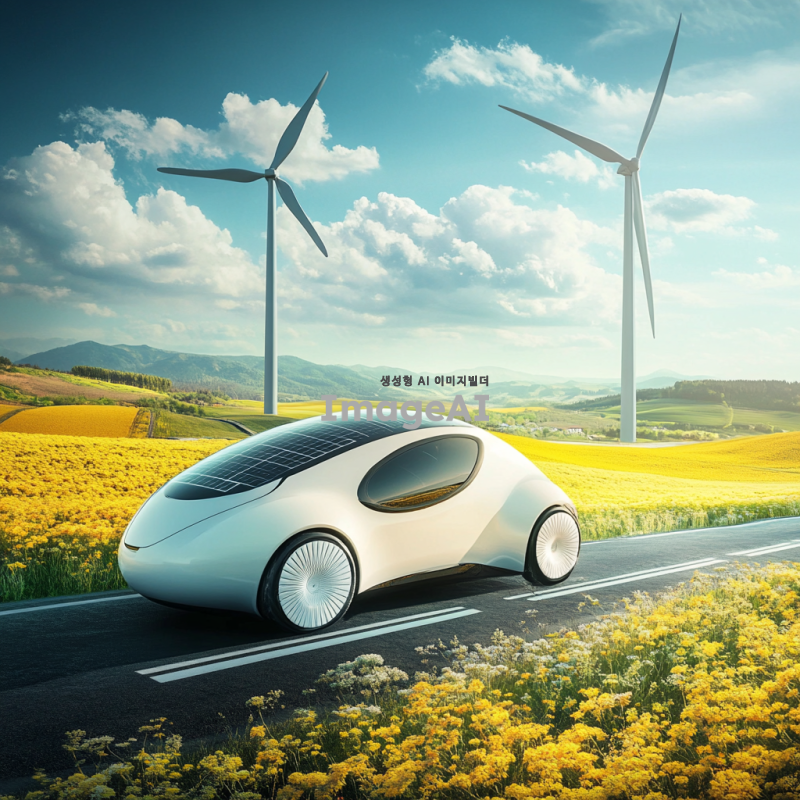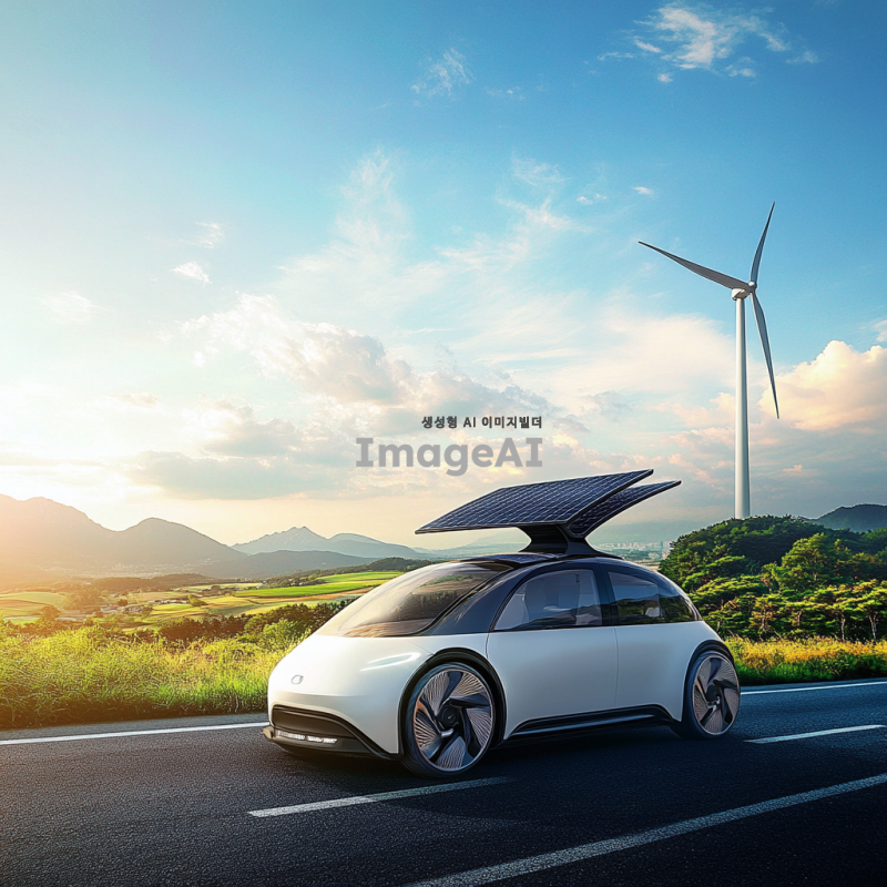 한국의 풍경 속에서 바람을 이용해 움직이는 미래형 풍력자동차, sleek하고 현대적인 디자인의 자동차가 바람개비와 함께 조화를 이루며 달리는 모습, 푸른 하늘과 푸른 들판 배경, 자연과 기술의 조화, 태양광 패널이 장착된 지붕, 친환경적인 느낌 강조, 밝고 생동감 있는 색상.