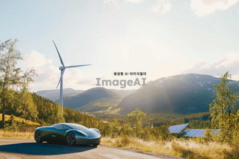 세련된 디자인의 풍력 자동차가 스웨덴의 아름다운 산지에서 자연과 조화를 이루며 주행하는 모습. 맑은 하늘과 푸른 숲, 그리고 멀리 보이는 산들이 배경을 이루고, 자동차는 최신 기술이 적용된 친환경적인 외관을 가지고 있다. 자동차 주변에는 바람개비와 태양광 패널이 어우러져 있는 풍경이 포함되어 있으며, 전체적으로 청정 에너지를 상징하는 이미지.