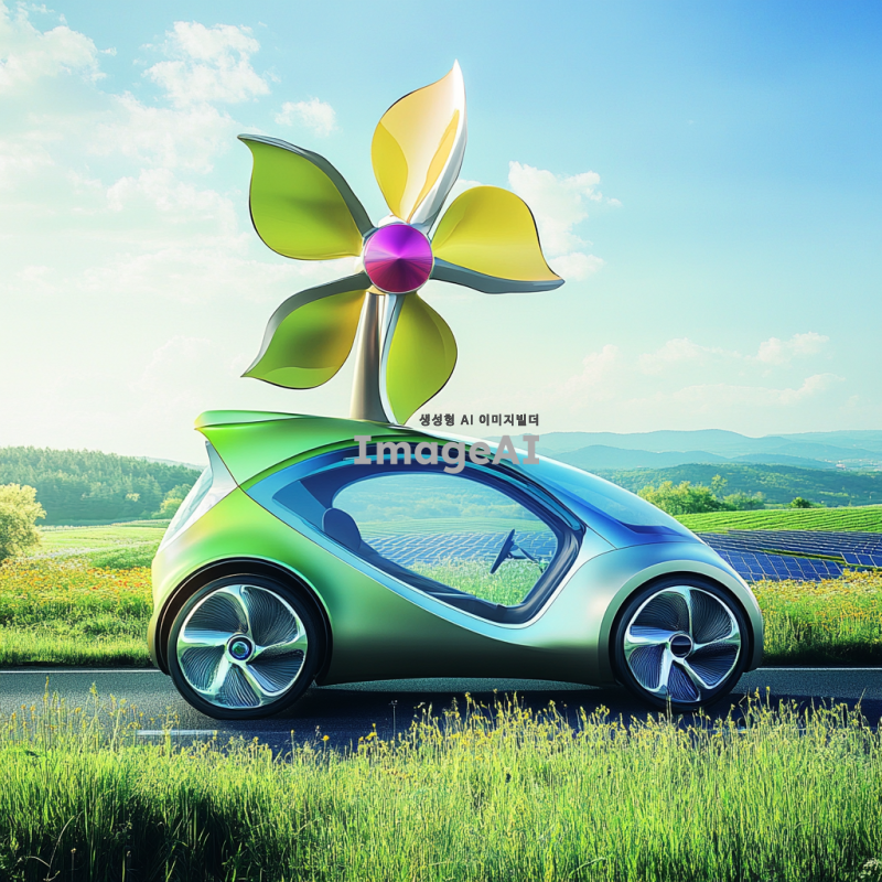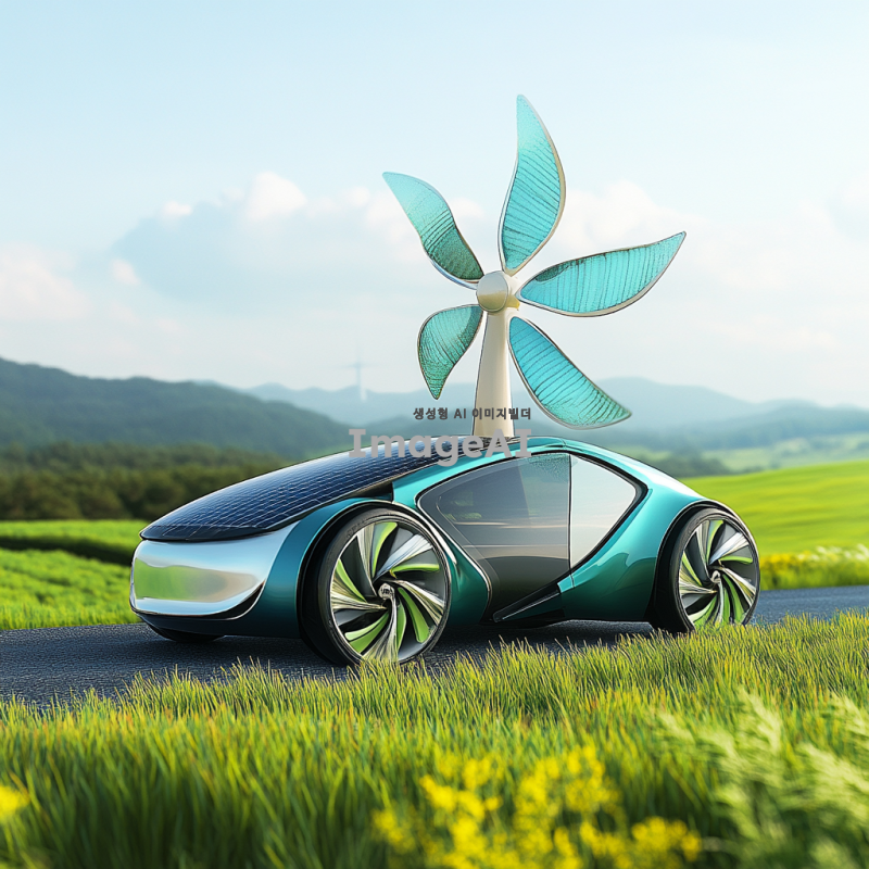 한국의 아름다운 자연 속에서 풍력 에너지를 활용하여 움직이는 미래형 자동차를 설계해보세요. 자동차는 유선형 디자인으로, 바람개비 형태의 풍력 터빈이 차량의 지붕에 장착되어 있습니다. 주변에는 푸른 들판과 맑은 하늘이 펼쳐져 있으며, 태양광 패널이 부착된 전기차와 함께 주행하는 모습이 담겨 있습니다. 자동차의 색상은 자연과 조화를 이루는 녹색과 파란색으로, 친환경적인 느낌을 강조합니다.