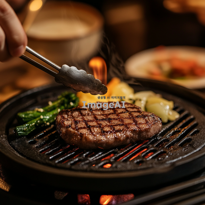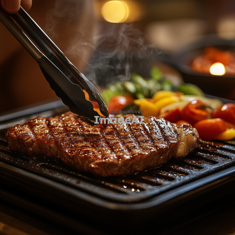 한국의 전통적인 식탁 위에 놓인 스테이크, 집게를 사용하여 조리 중인 모습. 스테이크는 고소한 갈색으로 구워져 있으며, 주변에는 신선한 채소와 함께 플레이팅된 모습. 따뜻한 조명이 비추는 아늑한 분위기 속에서 요리하는 손의 디테일이 강조된 장면.