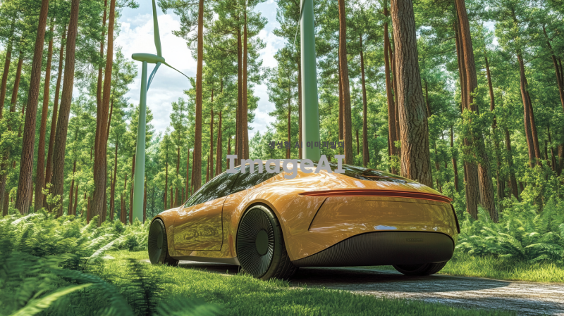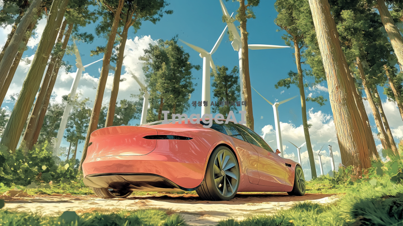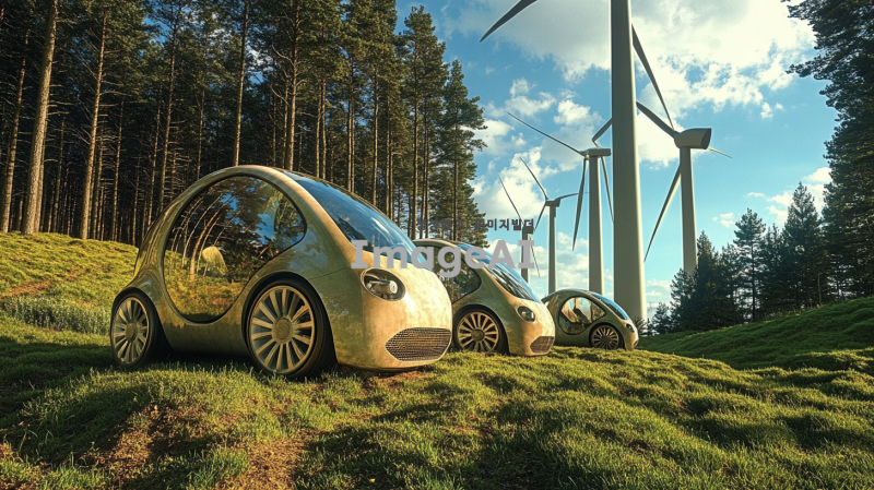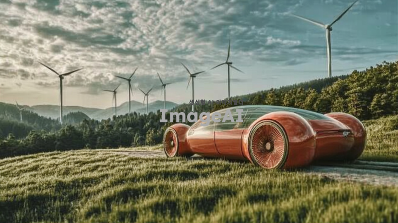 풍력으로 움직이는 자동차를 중심으로 한 이미지. 자동차는 바람의 힘으로 움직이고 있는 모습으로, 바람개비처럼 회전하는 바람의 힘을 상징적으로 표현. 주변에는 풍력 발전기가 멀리 보이고, 푸른 나무들이 자연을 이루고 있는 배경. 자동차의 디자인은 현대적이고 미래지향적이며, 바람을 받아들이는 구조로 되어있음. 전체적인 분위기는 깨끗하고 친환경적인 느낌을 강조.
