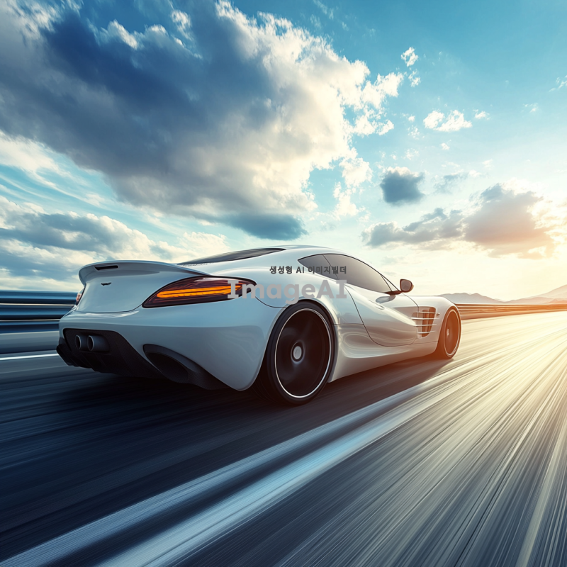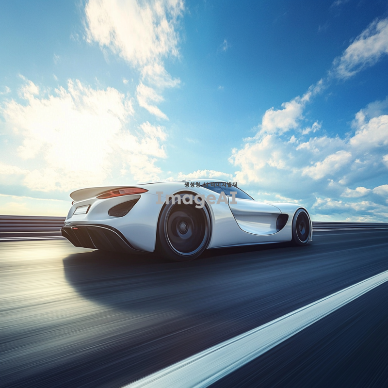 고속도로를 질주하는 한국의 스포츠카, 매끄러운 디자인과 강력한 엔진을 강조, 배경은 푸른 하늘과 구름, 차체는 반사되는 햇빛을 받아 빛나는 모습, 속도감이 느껴지는 장면.친환경적인
