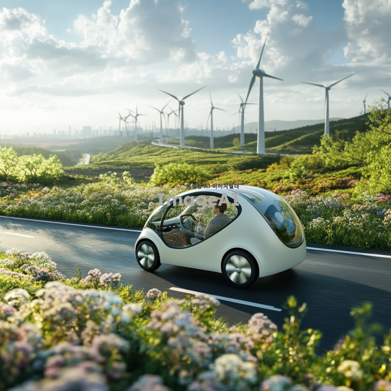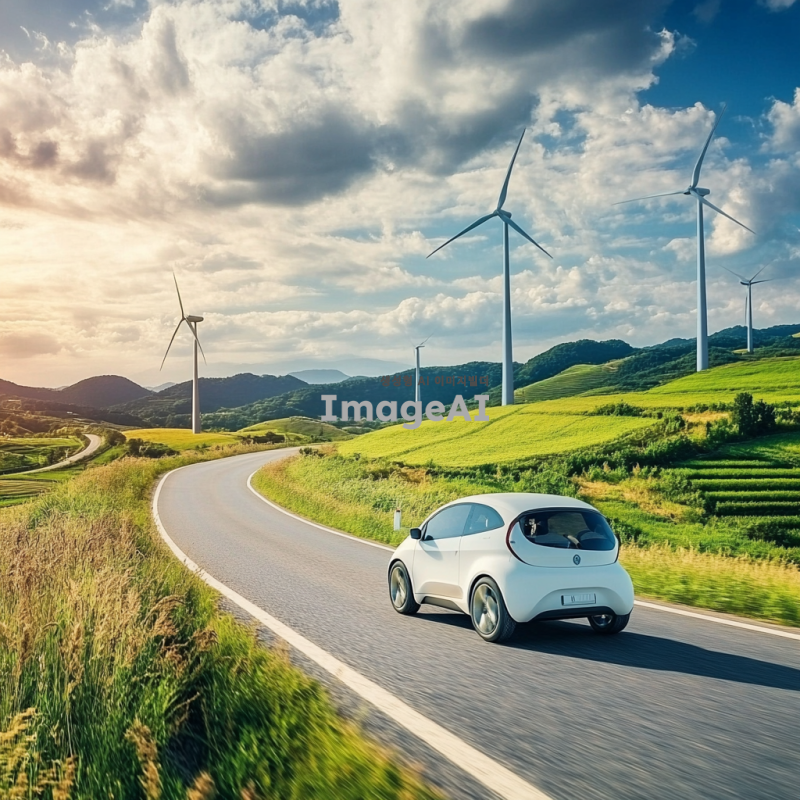 친환경 풍력자동차, 풍력을 활용한 혁신적인 디자인, 매끄러운 곡선과 현대적인 외관, 푸른 자연 배경 속에서 주행 중인 모습, 바람개비와 함께 어우러진 풍경, 지속 가능한 미래를 상징하는 이미지, 한국의 도로를 배경으로 한 모습