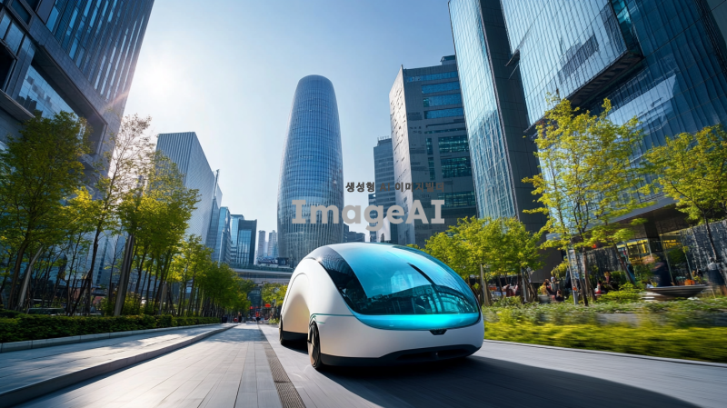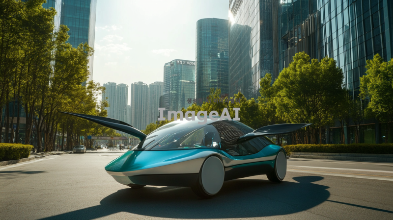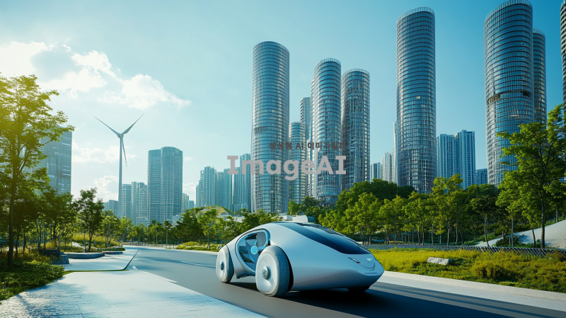 한국의 현대적인 도시 배경 속에서 바람의 힘을 이용해 움직이는 미래형 풍력자동차. 자동차는 유선형 디자인으로, 바람개비가 장착되어 있어 바람을 받아들이는 모습. 차량 주변에는 푸른 자연과 함께 고층 빌딩이 조화를 이루고, 맑은 하늘 아래에서 햇빛이 반사되는 장면. 자동차의 색상은 밝은 파란색과 흰색의 조화로, 친환경적인 느낌을 강조.