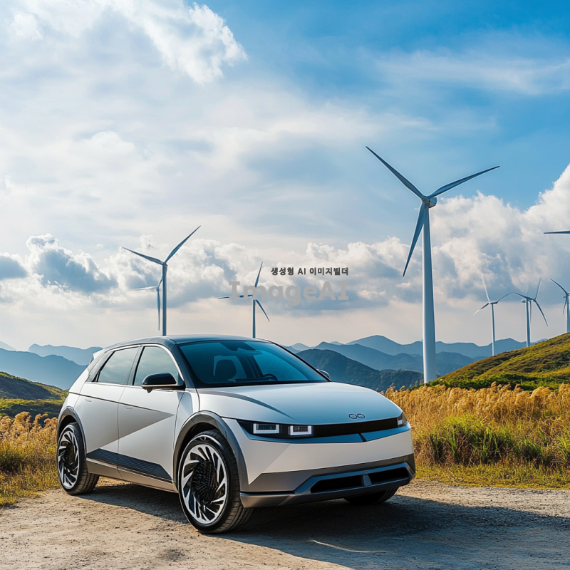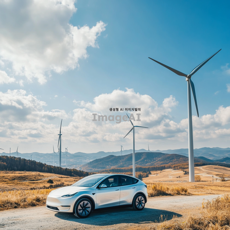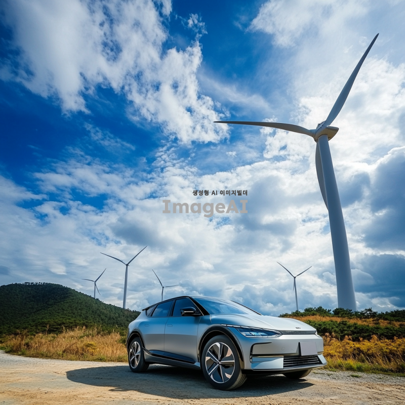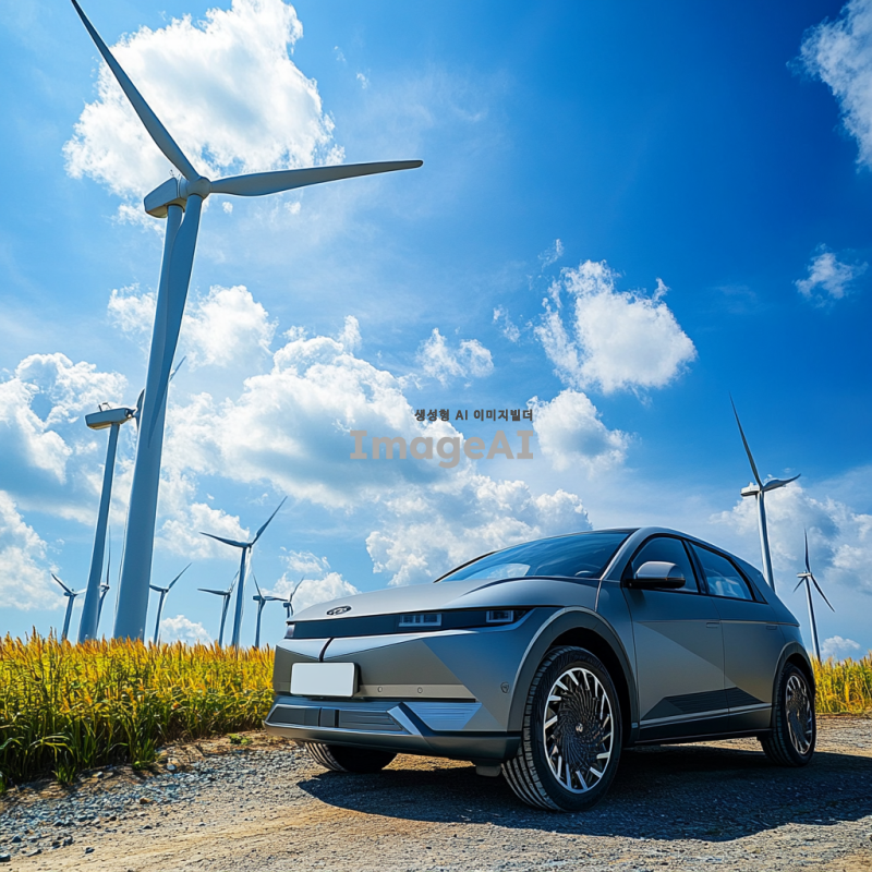 한국의 풍력 발전소 앞에 서 있는 현대적인 전기 자동차, 푸른 하늘과 구름이 떠 있는 배경, 바람개비가 돌아가는 모습, 친환경적인 에너지의 상징, 미래지향적인 디자인, 자연과 조화를 이루는 풍경, 밝고 생동감 있는 색감