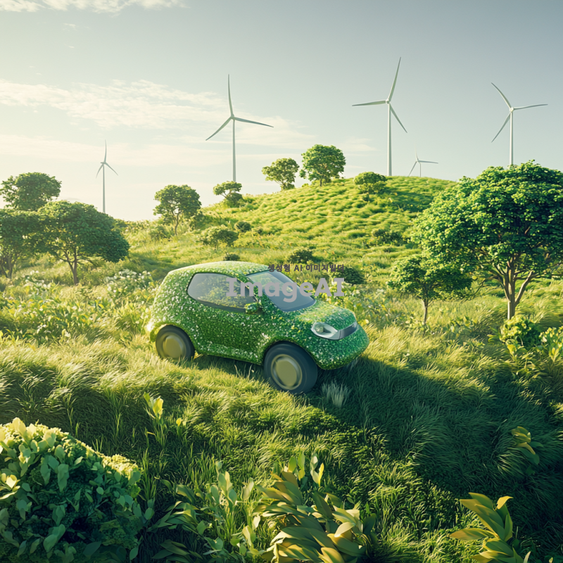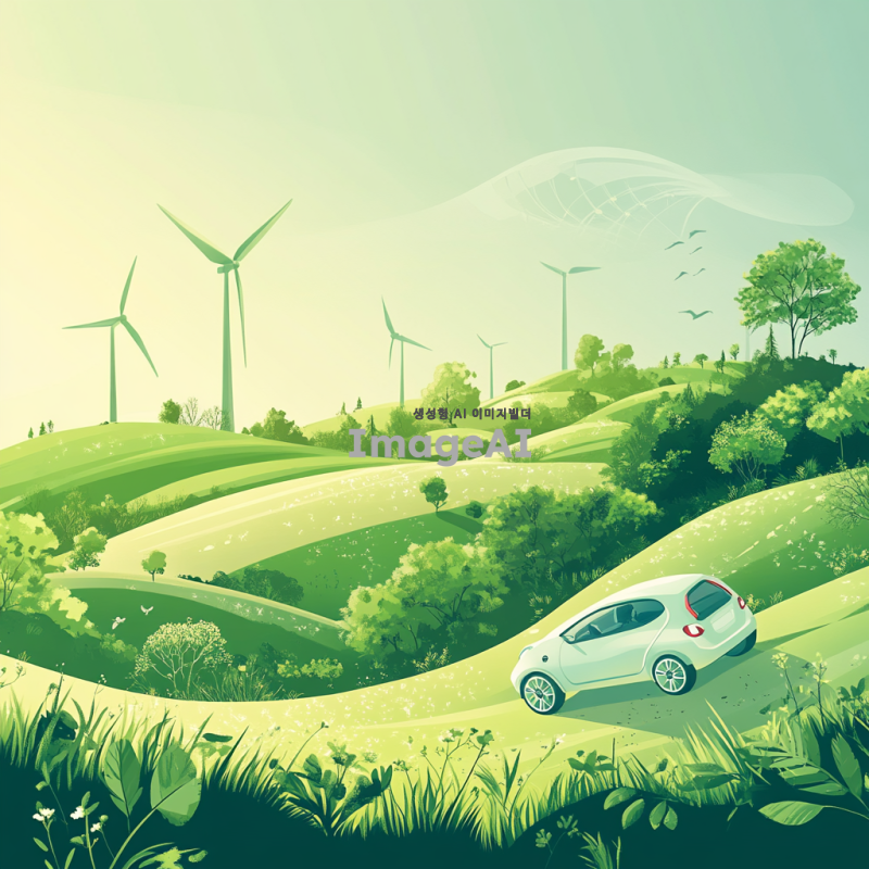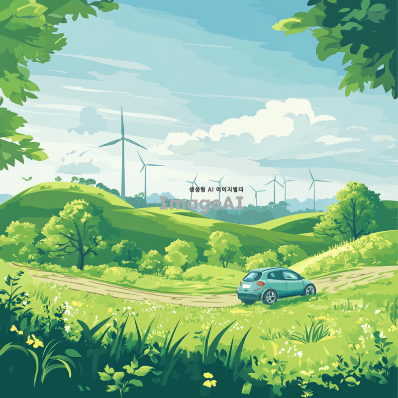 친환경 풍력자동차가 푸른 언덕을 힘차게 오르고 있는 모습. 맑은 하늘 아래 햇빛을 받아 반짝이는 풍력자동차의 디자인과 함께, 주변에 펼쳐진 푸른 자연경관. 바람에 흔들리는 나무와 풀, 그리고 멀리 보이는 풍력 발전기들이 조화를 이루는 장면.
