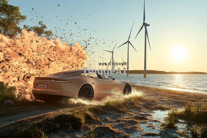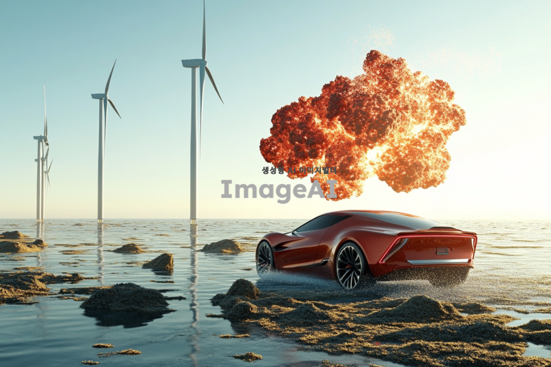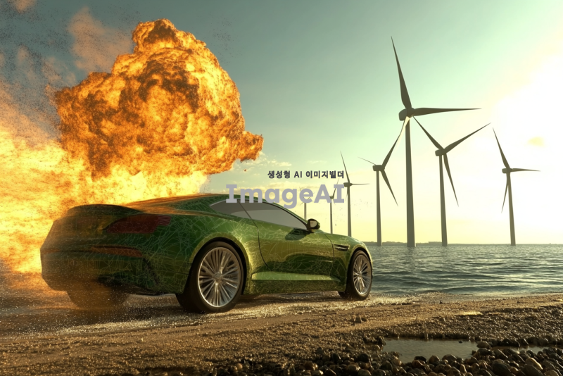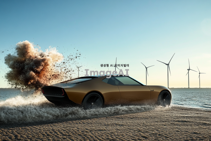 친환경 자동차가 바다를 가로지르며 태양을 등지고 있는 모습. 자동차의 뒤쪽에서 폭발이 일어나고 있으며, 풍력 발전기가 배경에 보이는 장면. 자연과 조화를 이루는 미래적인 디자인의 자동차, 푸른 바다와 맑은 하늘, 역동적인 분위기.