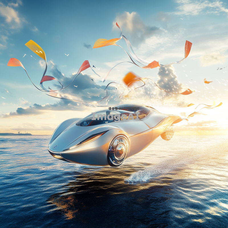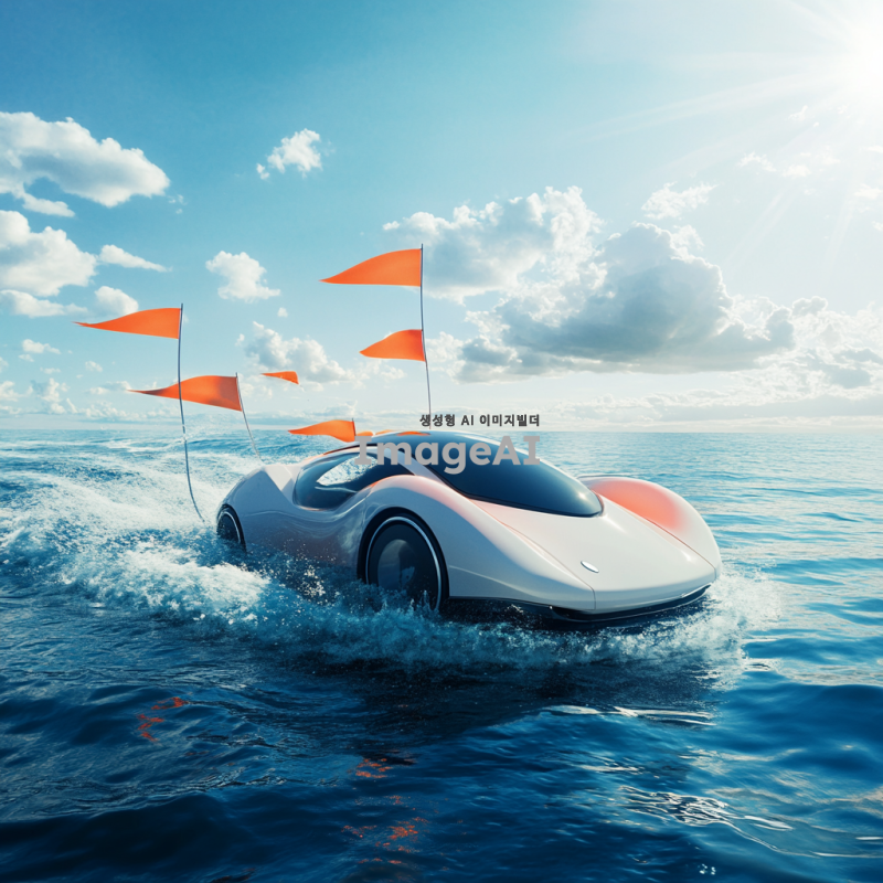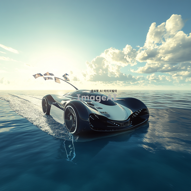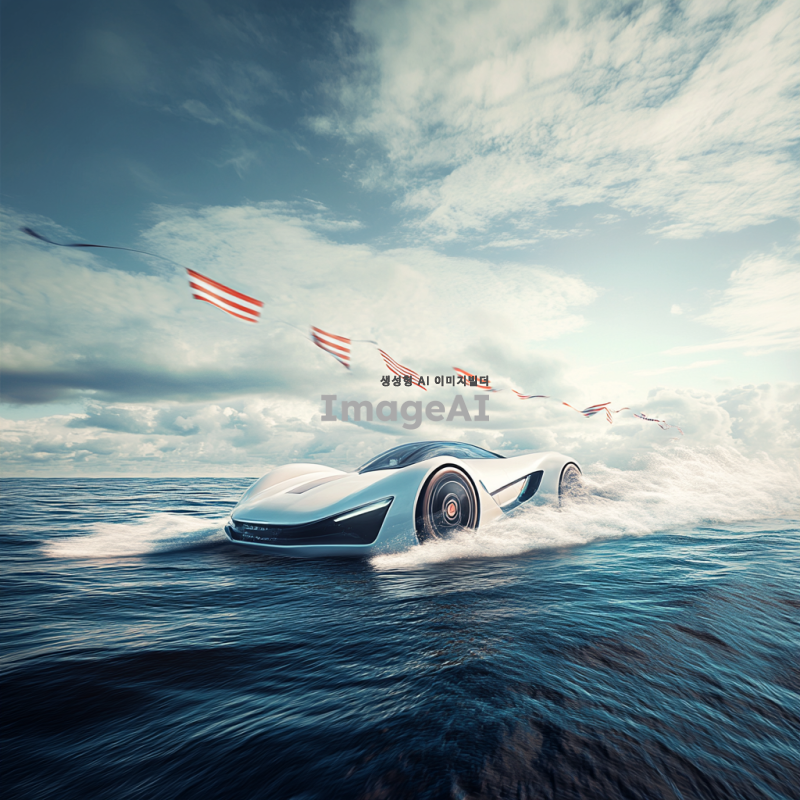 푸른 바다 위를 빠르게 달리는 현대적인 풍력자동차, 바람에 휘날리는 깃발과 함께 차량의 날렵한 디자인이 강조된 모습, 해양의 파도와 태양빛이 반사되는 장면, 배경에는 맑은 하늘과 흰 구름이 떠 있는 풍경, 미래적인 느낌과 함께 자연과 조화를 이루는 모습.