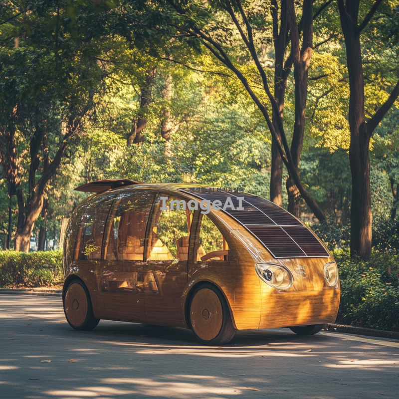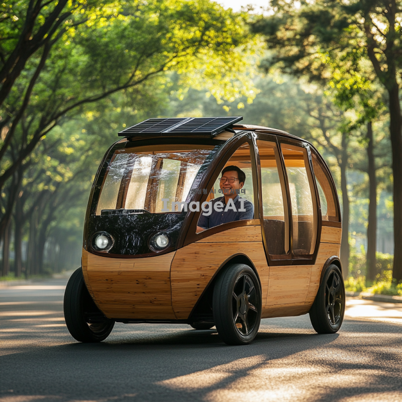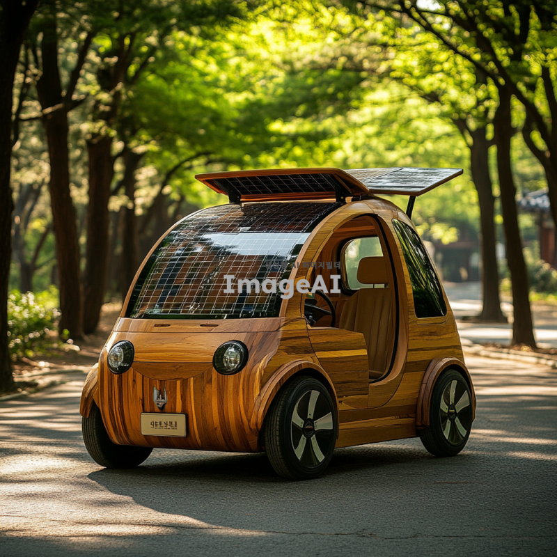 태양열 패널이 장착된 나무로 만들어진 자동차, 자연 친화적인 디자인, 푸른 숲 배경, 햇빛이 비치는 따뜻한 분위기, 한국인 운전자가 웃으며 운전하는 모습, 친환경적인 기술을 강조한 세련된 외관.