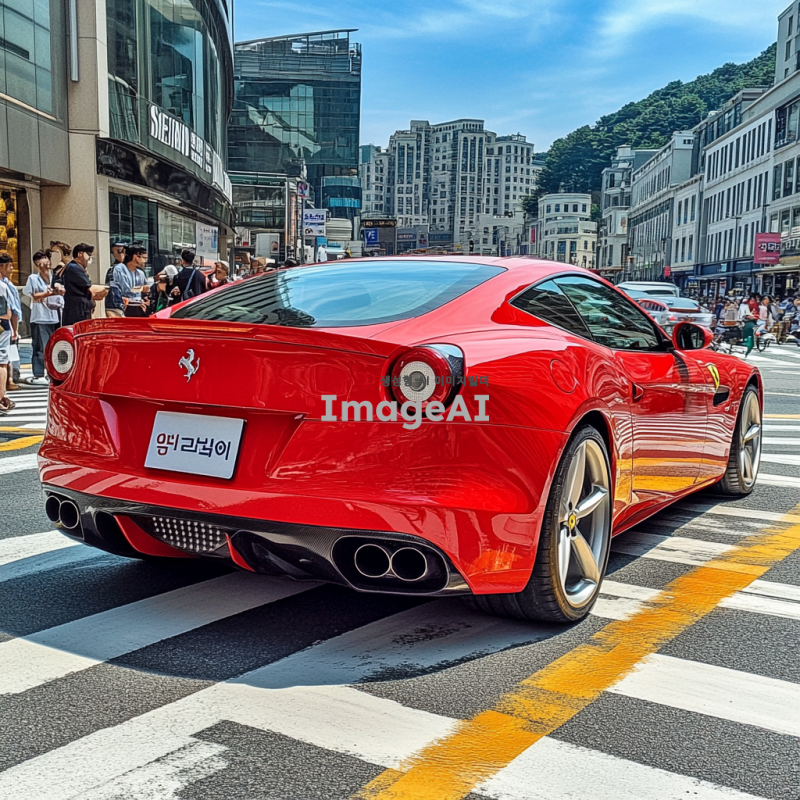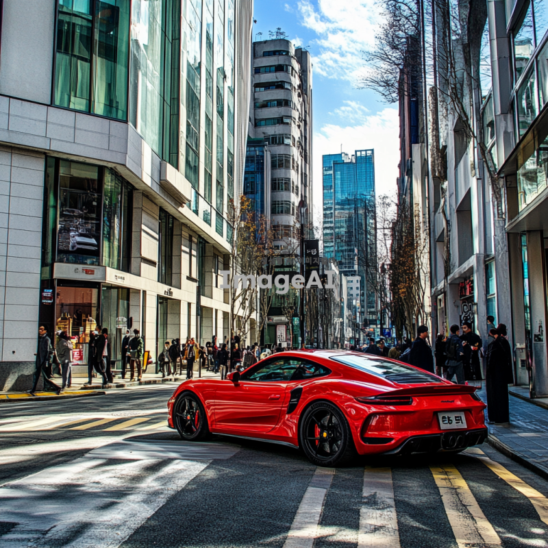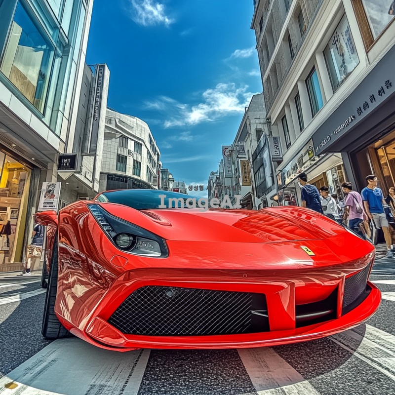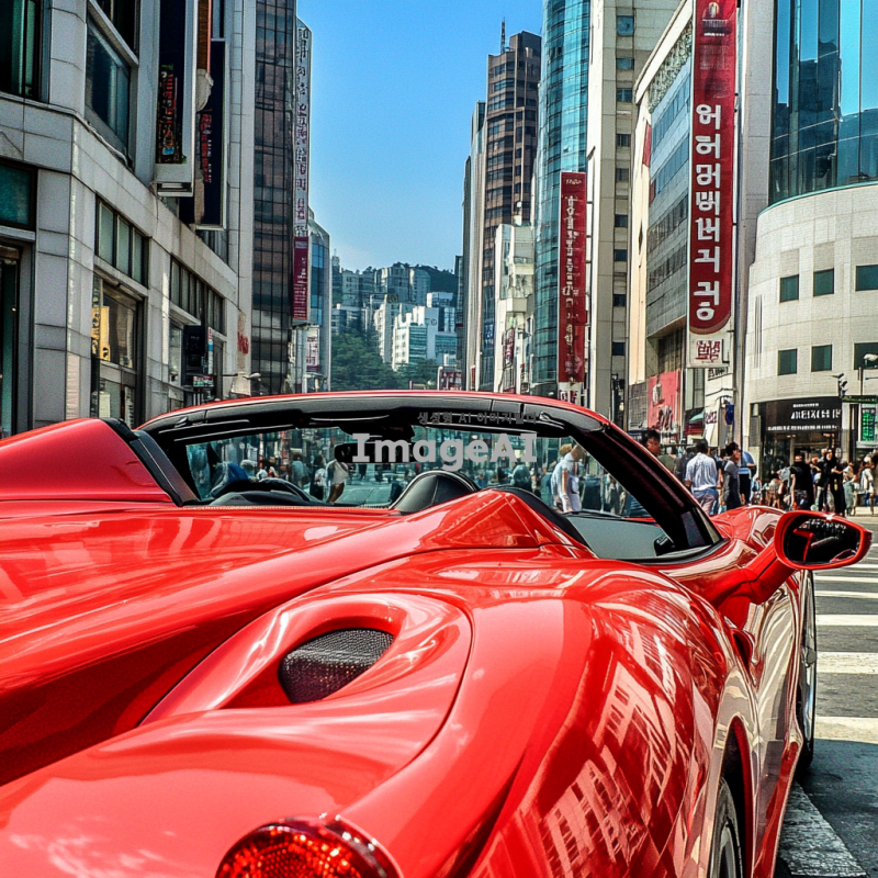 한국의 도시 거리에서 빨간색 스포츠카가 주차되어 있는 모습, 현대적인 건물과 푸른 하늘 배경, 햇살이 비치는 날, 차량의 세련된 디자인과 반사되는 빛 표현, 주변에 사람들은 지나가고 있는 일상적인 풍경.
