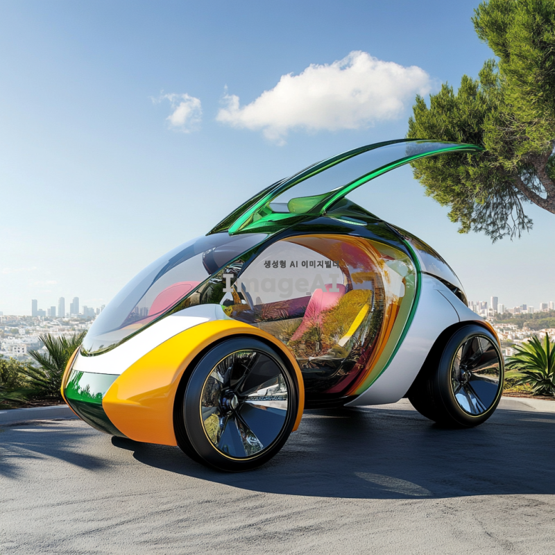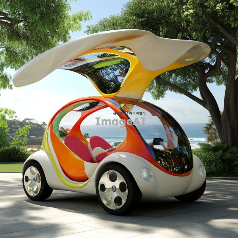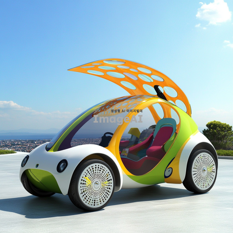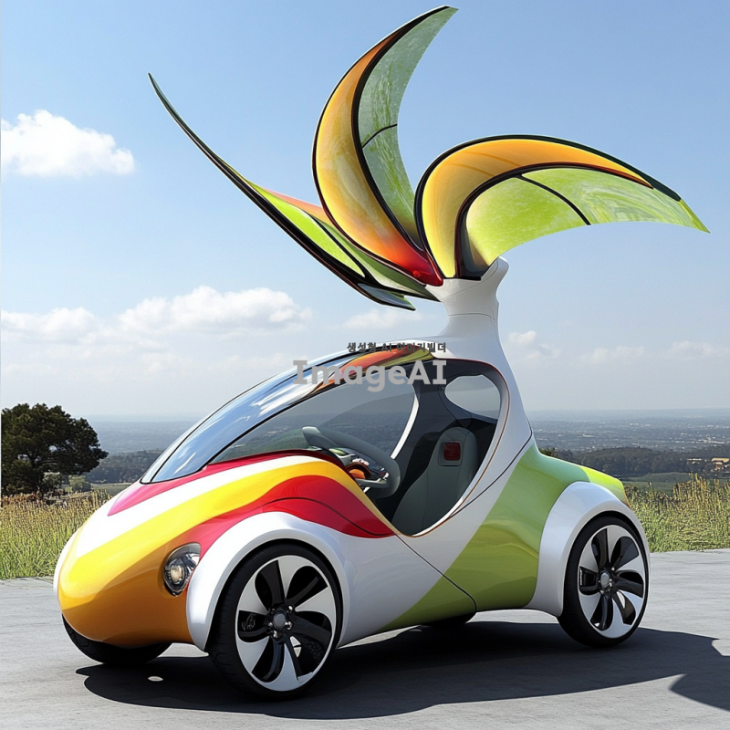 10대들이 선호할 만한 현대적이고 세련된 풍력 자동차 디자인, 다채로운 색상과 독특한 형태, 미래적인 요소가 가미된 외관, 에코 친화적인 느낌을 강조하며, 젊은 감각을 자극하는 스타일, 도심 환경에 잘 어울리는 디자인, 역동적인 자세와 함께 다양한 각도에서의 모습, 배경은 청명한 하늘과 푸른 자연 풍경.