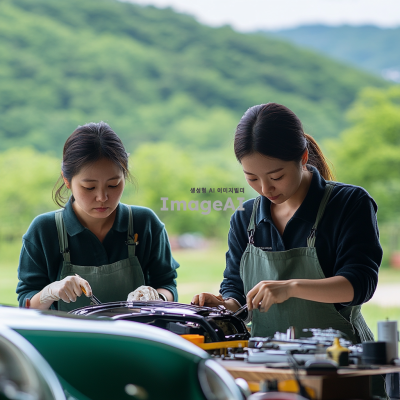 포르쉐를 조립하고 있는 한국인 여성 예은과 아라, 두 사람은 집중하며 작업 중이고, 뒷배경은 푸른 들판으로 펼쳐져 있다. 햇살이 비추는 밝은 날씨, 예은은 정교한 도구를 사용하고 있으며, 아라는 부품을 정리하고 있는 모습. 두 사람의 표정은 열정적이고 협력적인 분위기.