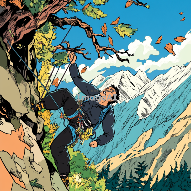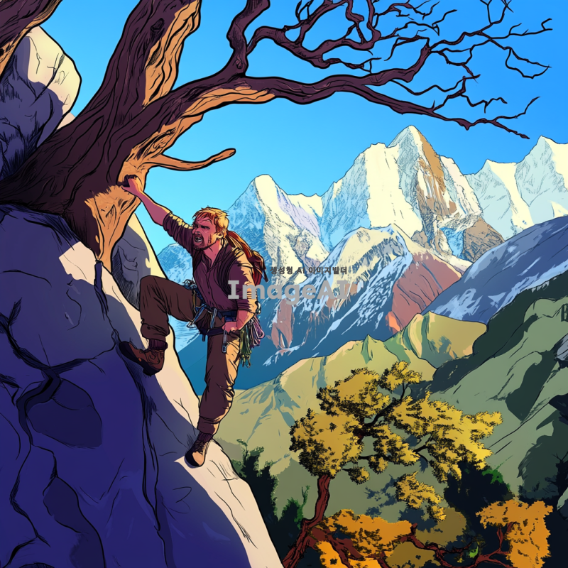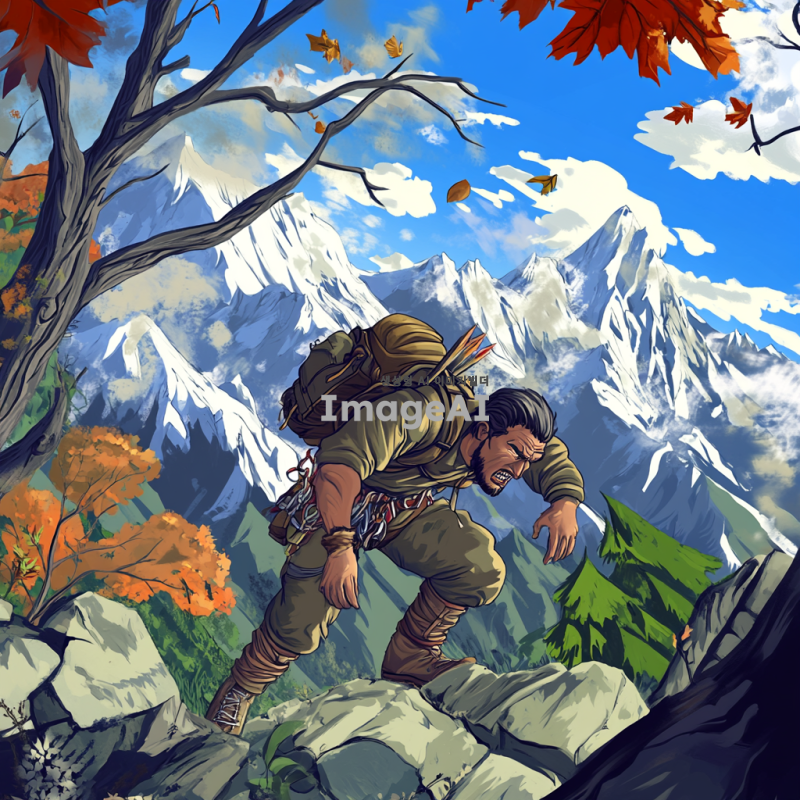 입냄새가 심한 남성이 히말라야 산맥을 등산하는 모습, 험준한 산악 배경, 눈 덮인 봉우리와 푸른 하늘, 남성은 등산 장비를 착용하고 힘든 표정을 지으며 오르는 모습, 주변에는 바람에 흔들리는 나무와 바위들이 보임, 생생한 자연의 색감과 극적인 조명 효과