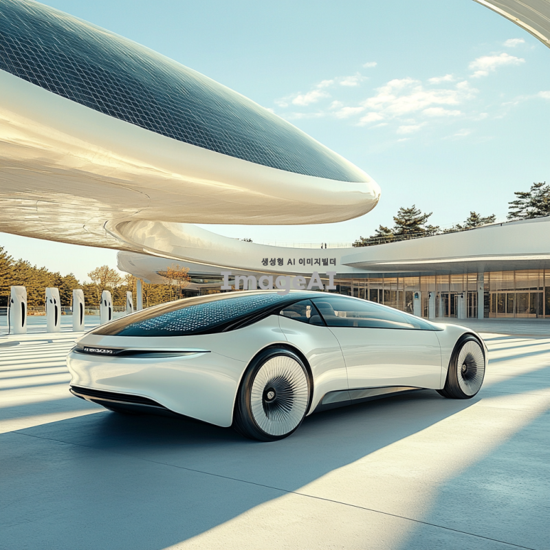 신재생 에너지를 활용한 현대적인 자동차 디자인, 매끄러운 곡선과 미래적인 외관, 태양광 패널이 장착된 지붕, 전기 충전소와 함께 있는 도시 풍경, 밝고 청명한 하늘 아래 주행 중인 모습, 친환경적인 느낌을 강조한 색상과 재질 사용, 한국의 도로 환경을 반영한 배경.