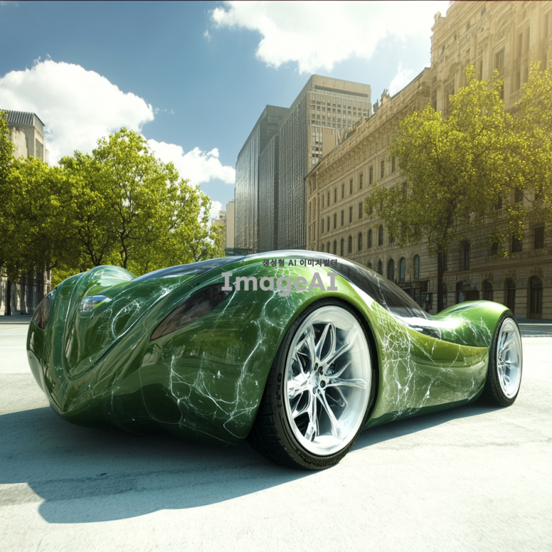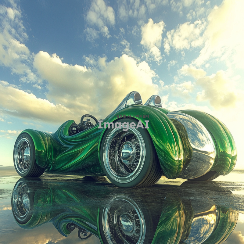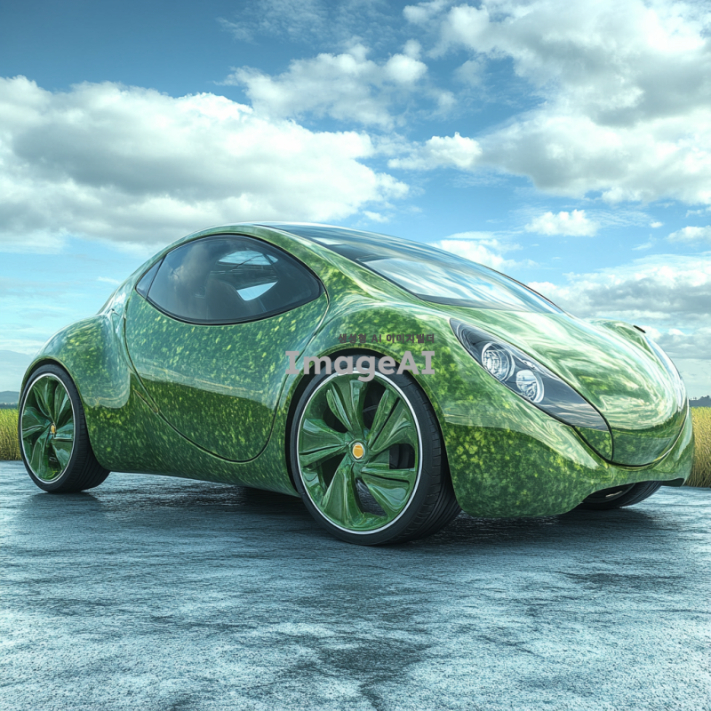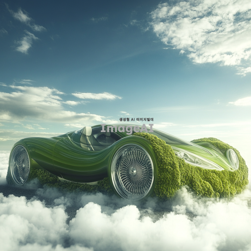 초록색 색감이 섞인 단단해 보이는 풍력 자동차 디자인, 미래적인 형태와 유선형의 외관, 10대들이 좋아할 만한 역동적인 느낌, 에코 친화적인 요소 강조, 배경은 푸른 하늘과 구름으로 가득 찬 풍경, 자동차의 바퀴는 독특한 스타일로 디자인되어 있음, 전체적인 분위기는 현대적이고 세련됨.