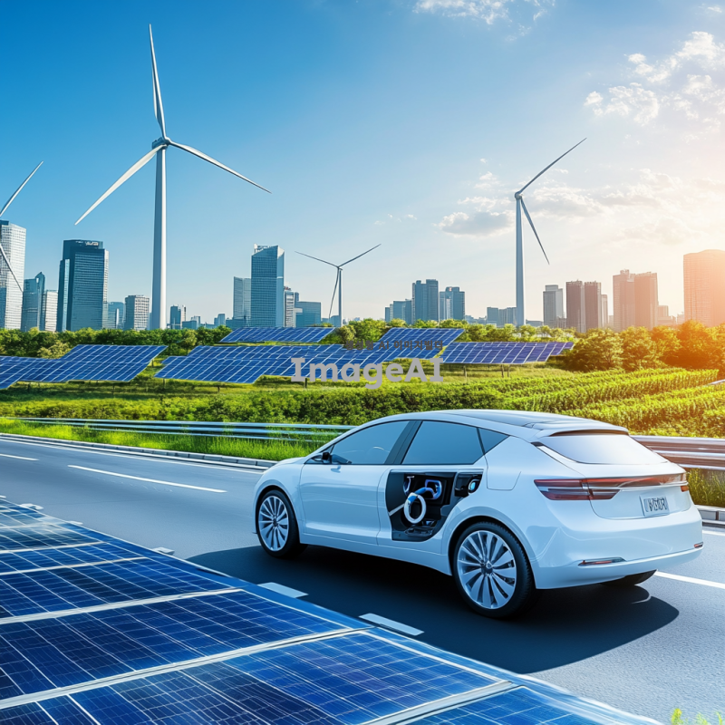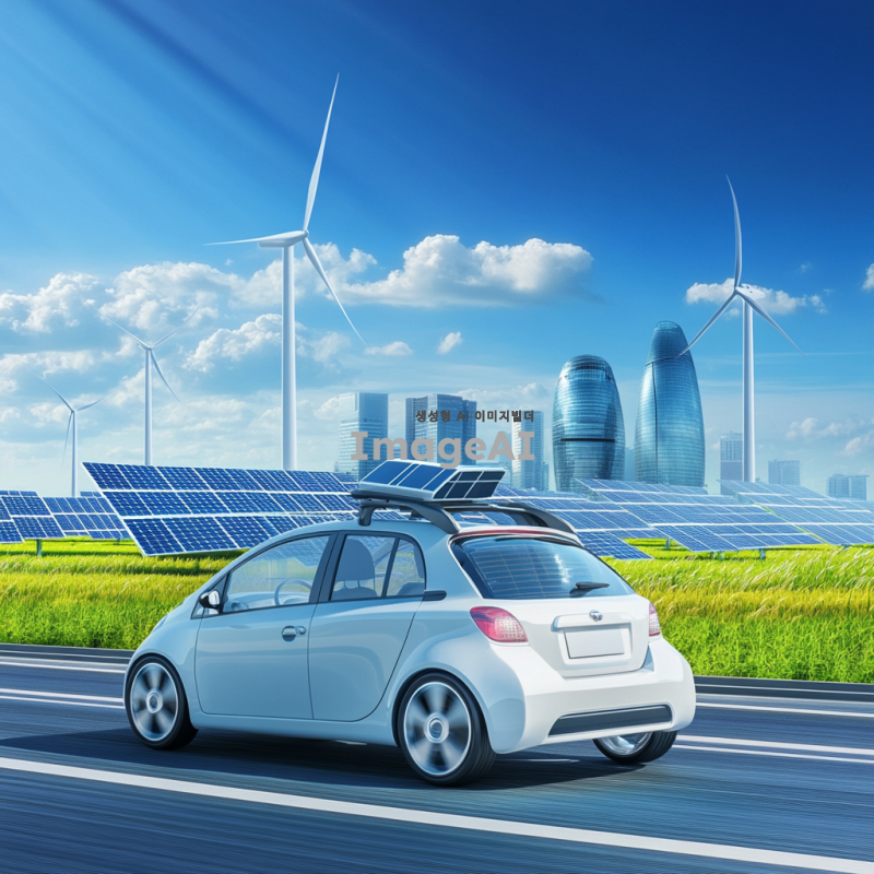 신재생 에너지를 활용한 친환경 자동차가 도로를 주행하는 모습, 현대적인 디자인의 전기차, 주변에 태양광 패널과 풍력 발전기가 있는 풍경, 푸른 하늘과 맑은 공기, 지속 가능한 미래를 상징하는 이미지, 한국의 도시 배경.