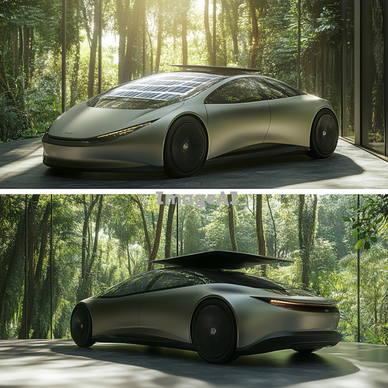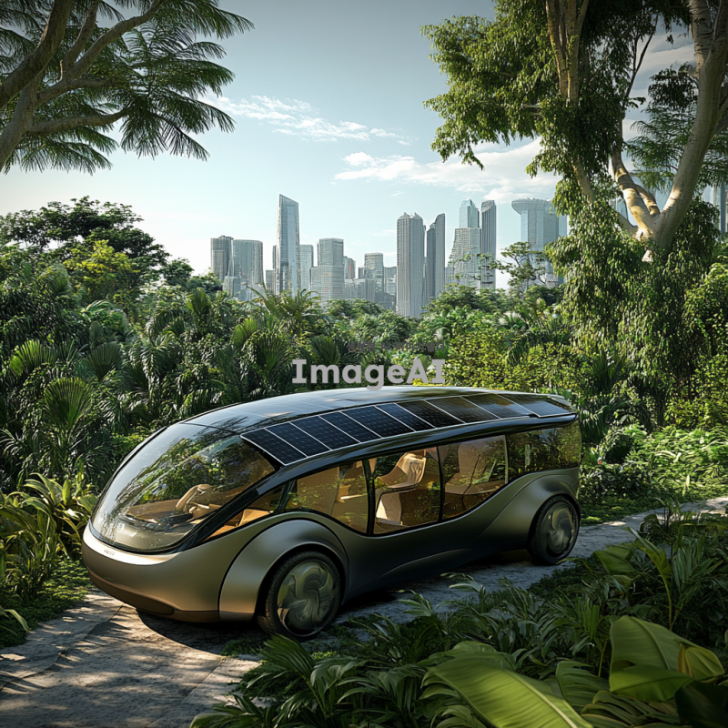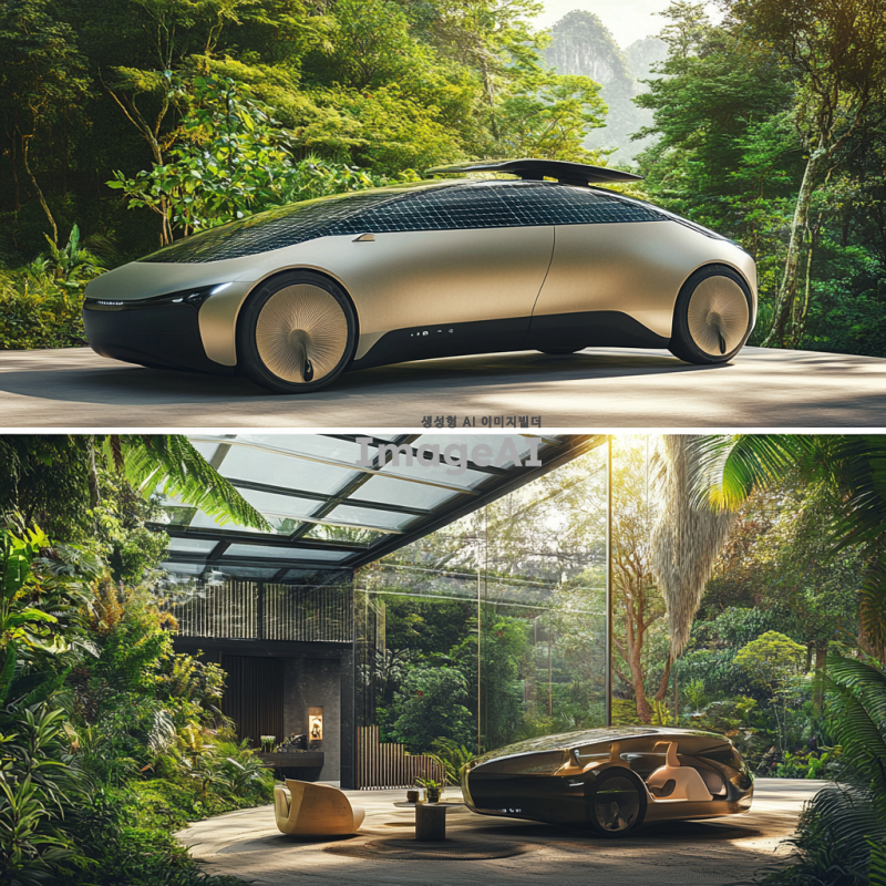 친환경적인 디자인의 현대적인 자동차, 유선형의 외관과 자연을 모티프로 한 색상, 태양광 패널이 장착된 지붕, 푸른 숲 배경, 미래 지향적인 도시 풍경과 조화를 이루는 모습, 자연 친화적인 재료로 제작된 내부 인테리어, 친환경 기술이 강조된 세련된 스타일.