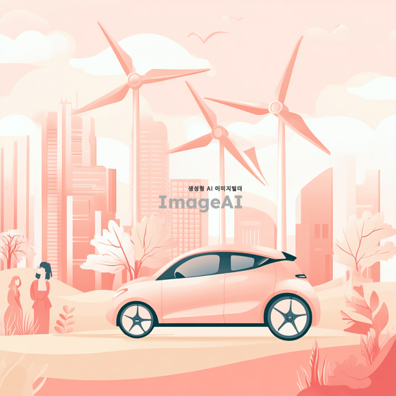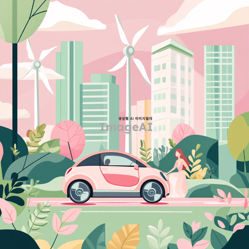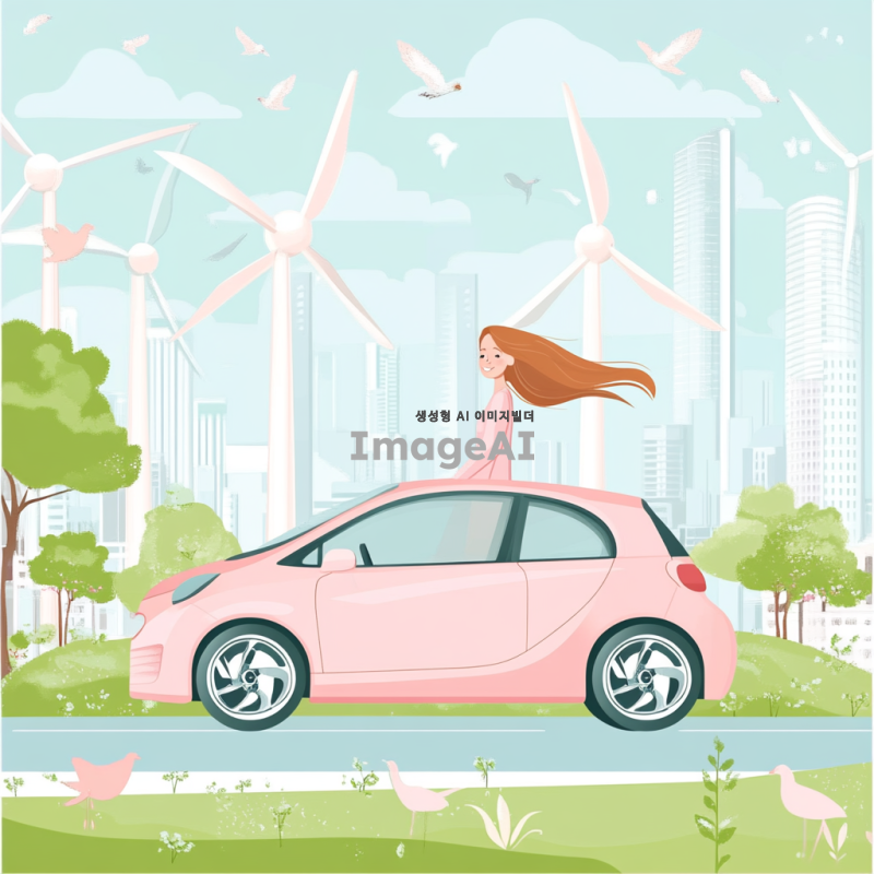 풍력 에너지를 사용하여 움직이는 자동차, 여성들이 선호하는 부드러운 파스텔 색상과 현대적인 디자인, 자연 속에서 바람에 의해 움직이는 모습, 자동차의 바퀴 주변에 회전하는 풍력 터빈, 세련된 도시 배경, 여성들이 자동차를 바라보며 미소 짓고 있는 장면, 친환경적인 느낌 강조