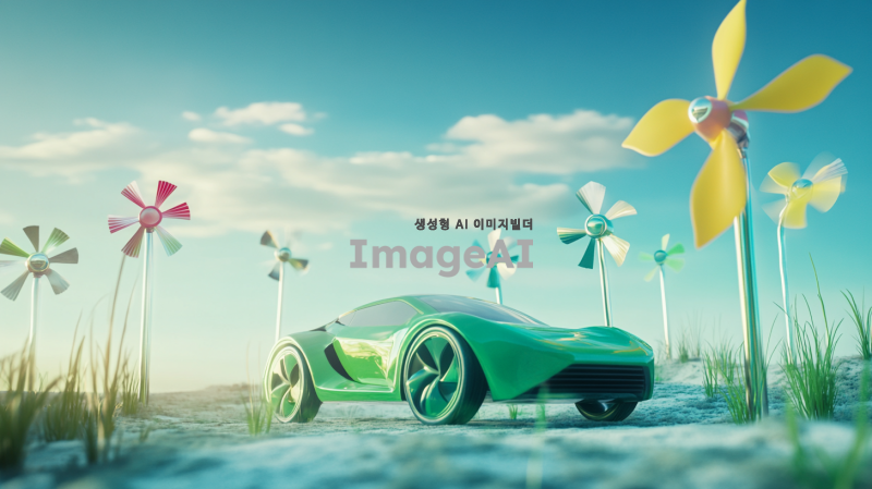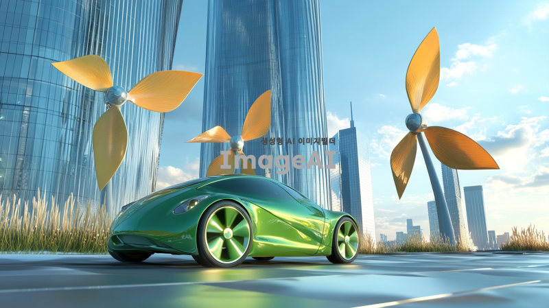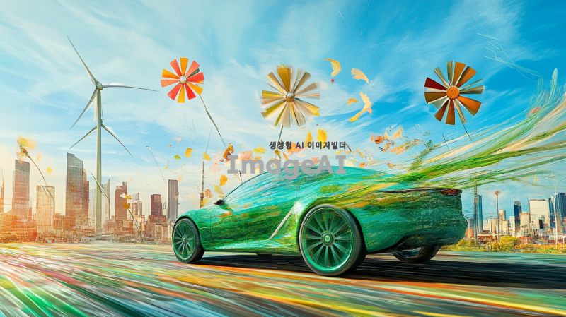 초록색 풍력자동차가 바람을 이용해 달리는 모습, 현대적인 디자인과 친환경적인 요소가 강조된 차량, 푸른 하늘과 맑은 자연 배경, 바람개비와 함께하는 풍력 발전의 상징적인 이미지, 미래 지향적인 도시 풍경과 조화롭게 어우러진 장면.