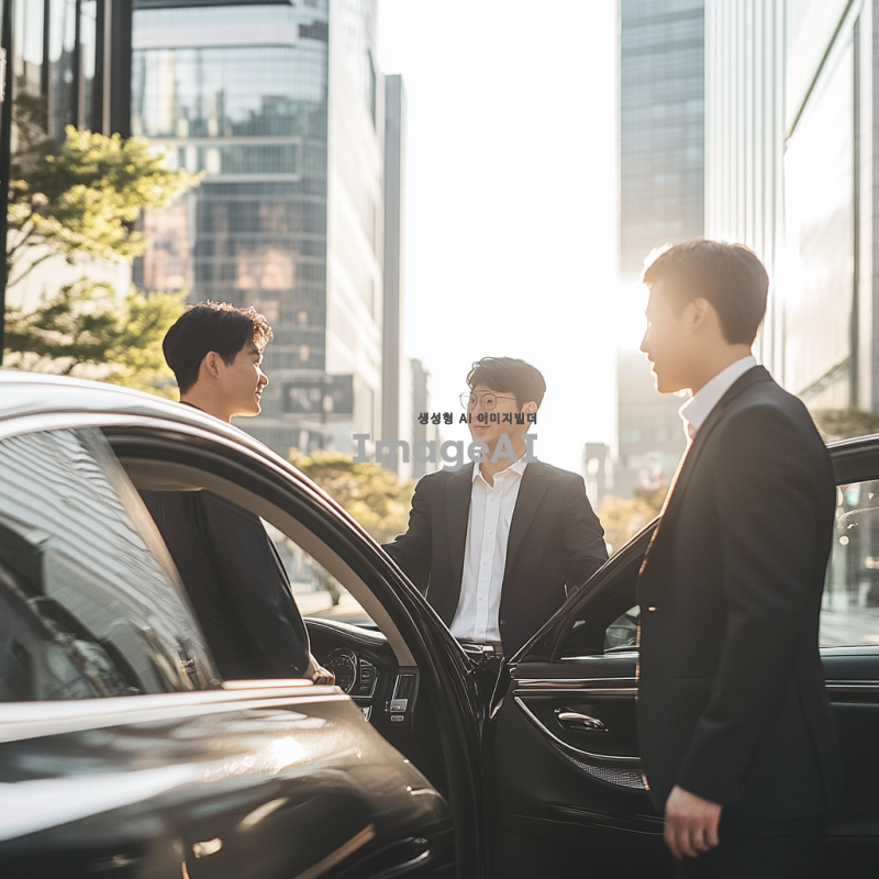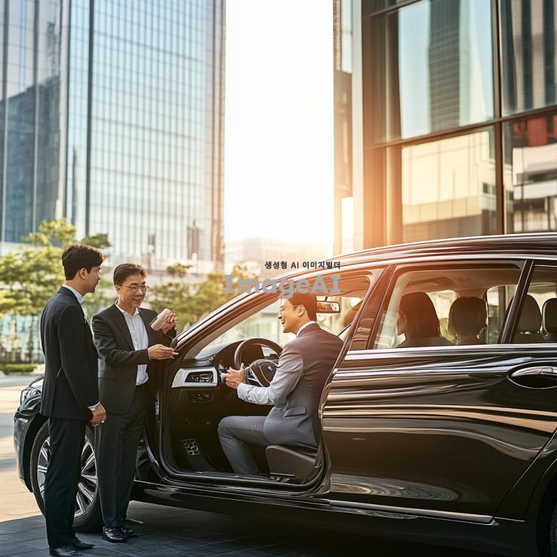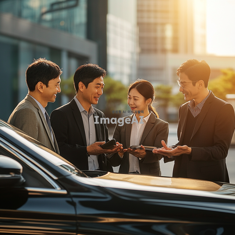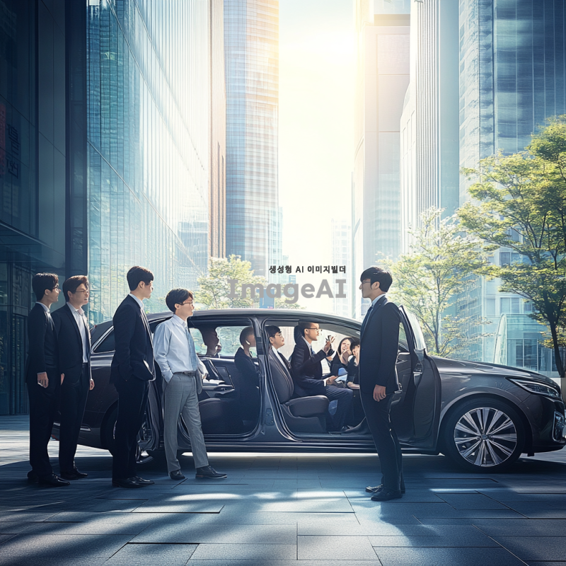 주주가 자동차에 탑승하고 있는 모습, 세련된 디자인의 자동차 안에서 주주들이 대화하는 장면, 현대적인 도시 배경, 밝은 햇살 아래, 다양한 연령대의 한국인 주주들, 비즈니스 캐주얼 복장, 자동차의 내부 디테일과 함께 주주들의 표정이 생동감 있게 표현된 이미지.