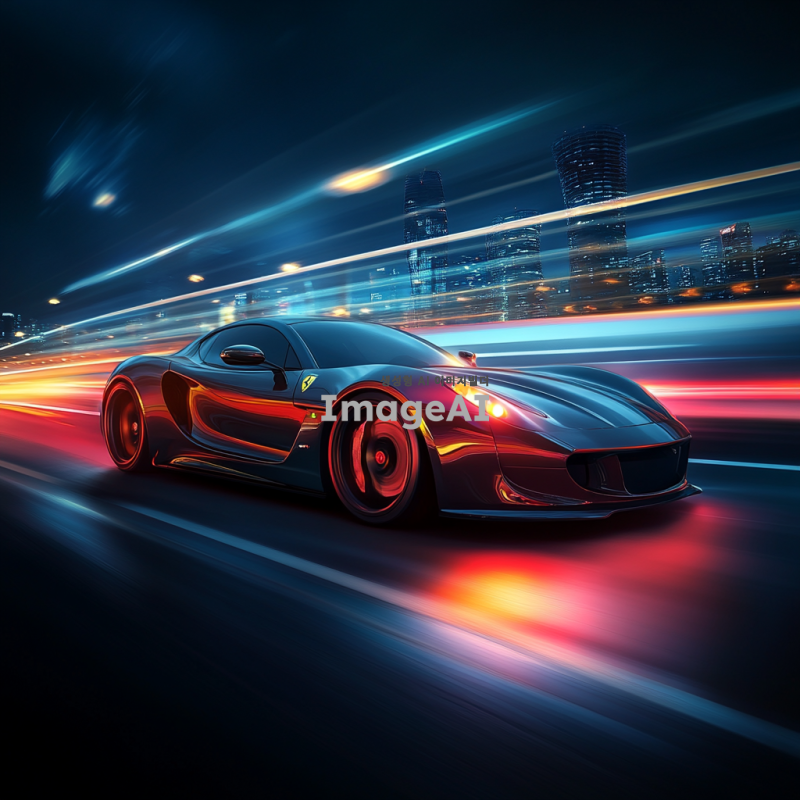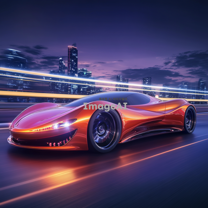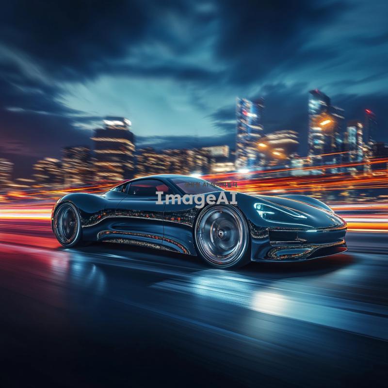 날렵하고 현대적인 디자인의 스포츠카, 매끄러운 곡선과 날카로운 엣지를 가진 외관, 강렬한 색상 조합, 고속 주행 중인 모습, 배경에는 도시의 야경이나 고속도로가 펼쳐져 있는 장면, 스포티한 느낌을 강조하는 조명 효과, 세련된 휠과 공기역학적인 특징이 잘 드러나도록.