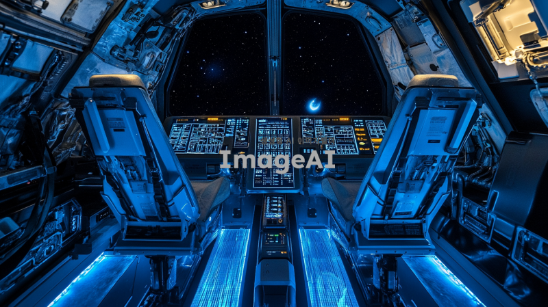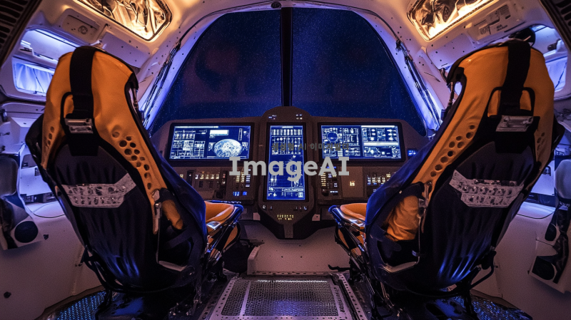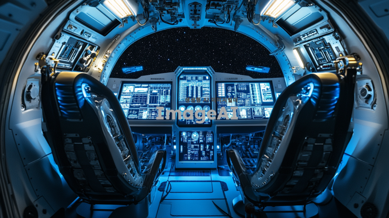 우주선 내부의 복잡한 기계 장치와 조명, 미래적인 디자인의 좌석, 대형 창문을 통해 보이는 별들이 반짝이는 우주 풍경, 다양한 버튼과 스크린으로 가득한 컨트롤 패널, 우주 비행사들이 작업하는 모습, 차가운 메탈과 블루톤의 조명으로 구성된 세련된 분위기, 생명 유지 장치와 다양한 장비들이 배치된 공간