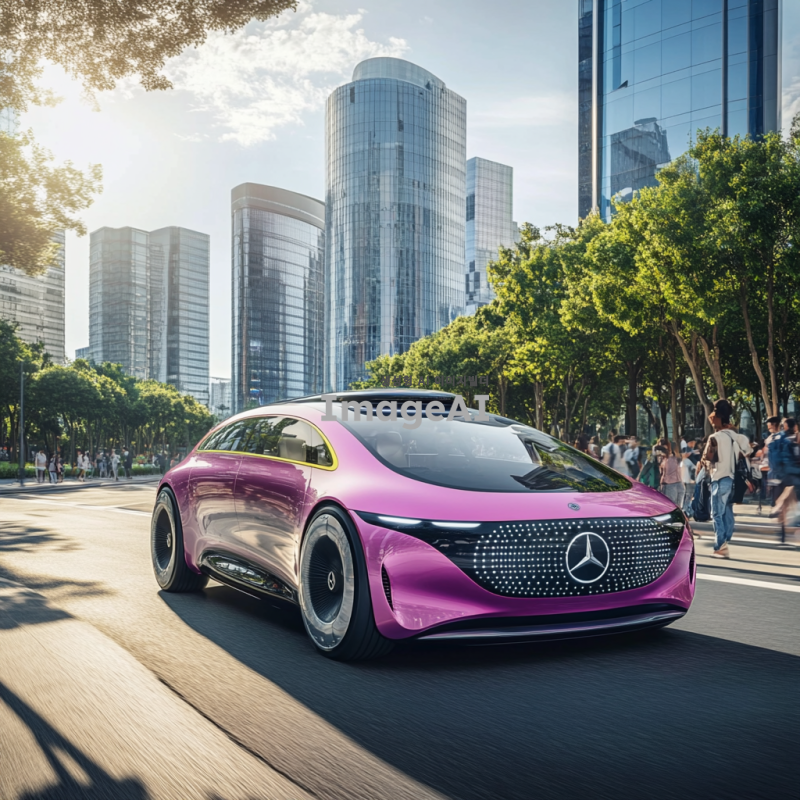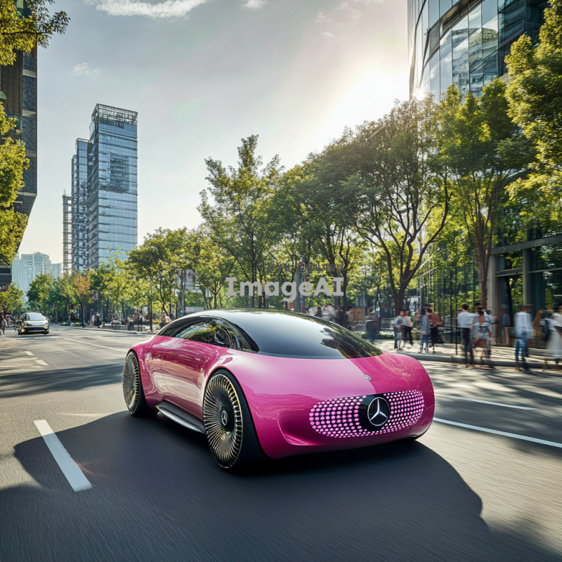 핑크색 벤츠 자율주행차가 도로를 주행하고 있는 모습, 현대적인 도시 배경, 햇살이 비치는 날, 주변에 사람들과 나무가 있는 풍경, 차량의 세련된 디자인과 색상이 강조되도록.