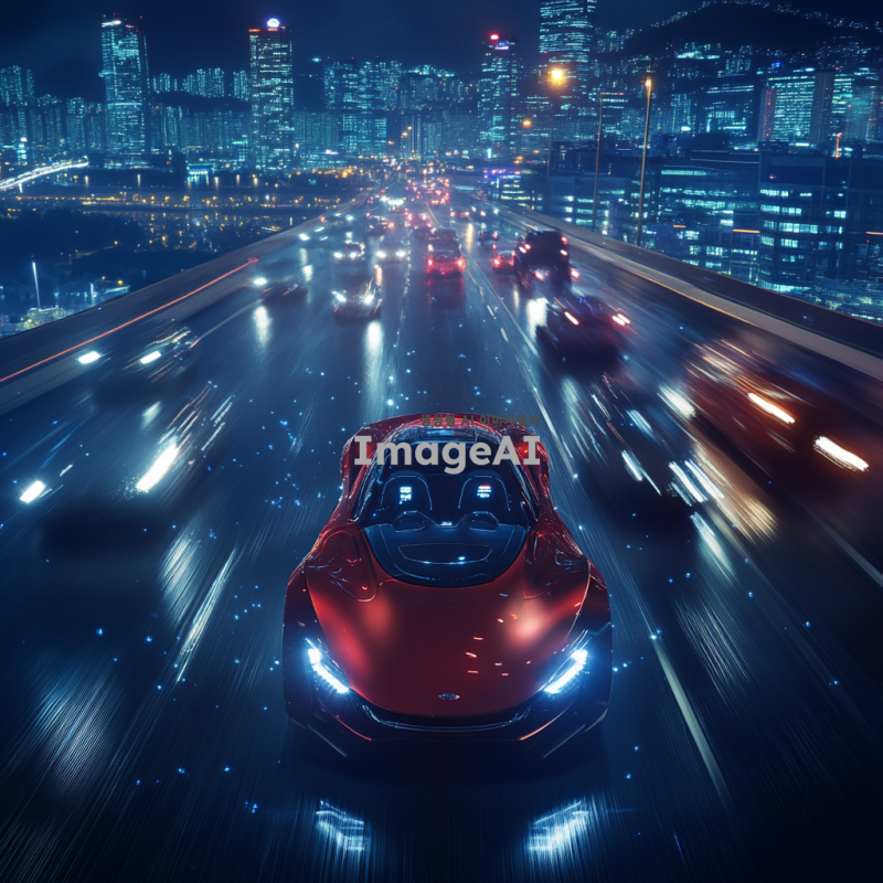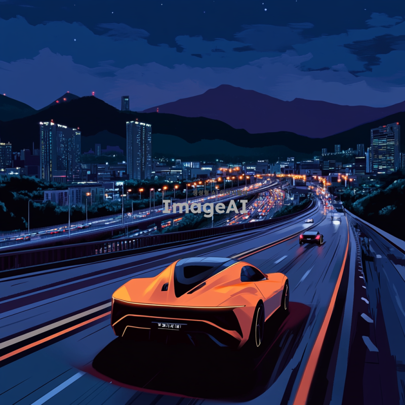한국의 도시에서 자율 주행 스포츠카가 도로를 주행하는 모습, 현대적인 디자인과 세련된 외관, 고속도로의 풍경과 함께 역동적인 주행 장면, 밤하늘의 도시 조명이 반사되는 차체, 미래지향적인 기술이 강조된 내부 모습, 안전 장치와 첨단 기술이 가득한 대시보드, 스포티한 느낌의 차량 디자인, 주변의 다른 차량들과의 조화로운 모습.