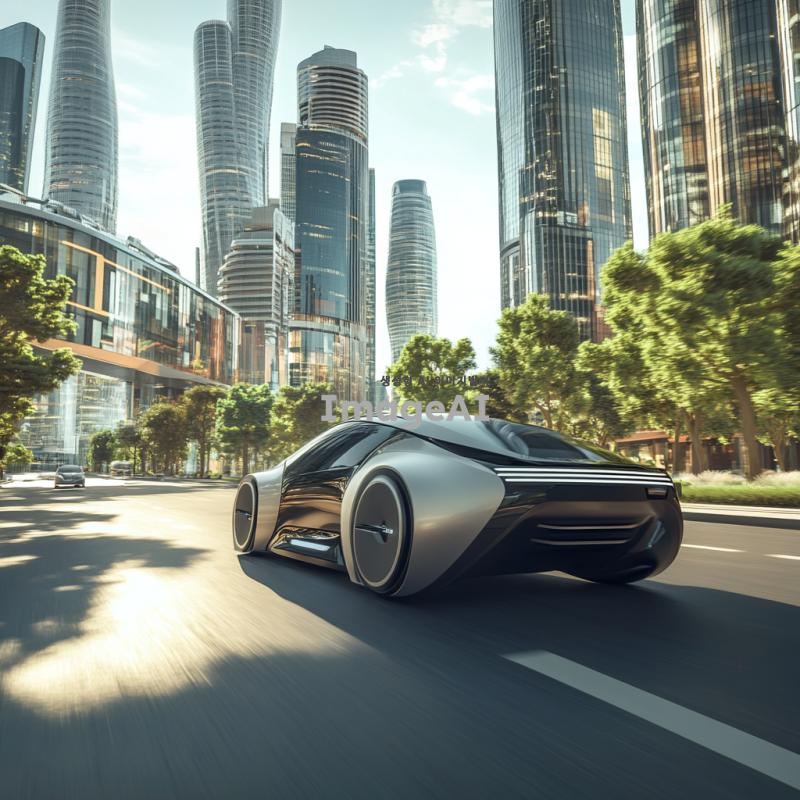 깔끔한 디자인의 자율 주행 자동차가 도시의 현대적인 거리에서 주행하고 있는 모습. 자동차는 매끈한 외관과 미래적인 요소가 결합되어 있으며, 주변은 고층 건물과 푸른 나무들이 어우러져 있는 풍경. 햇살이 비추는 밝은 날씨 속에서 자동차가 부드럽게 움직이고 있는 장면.