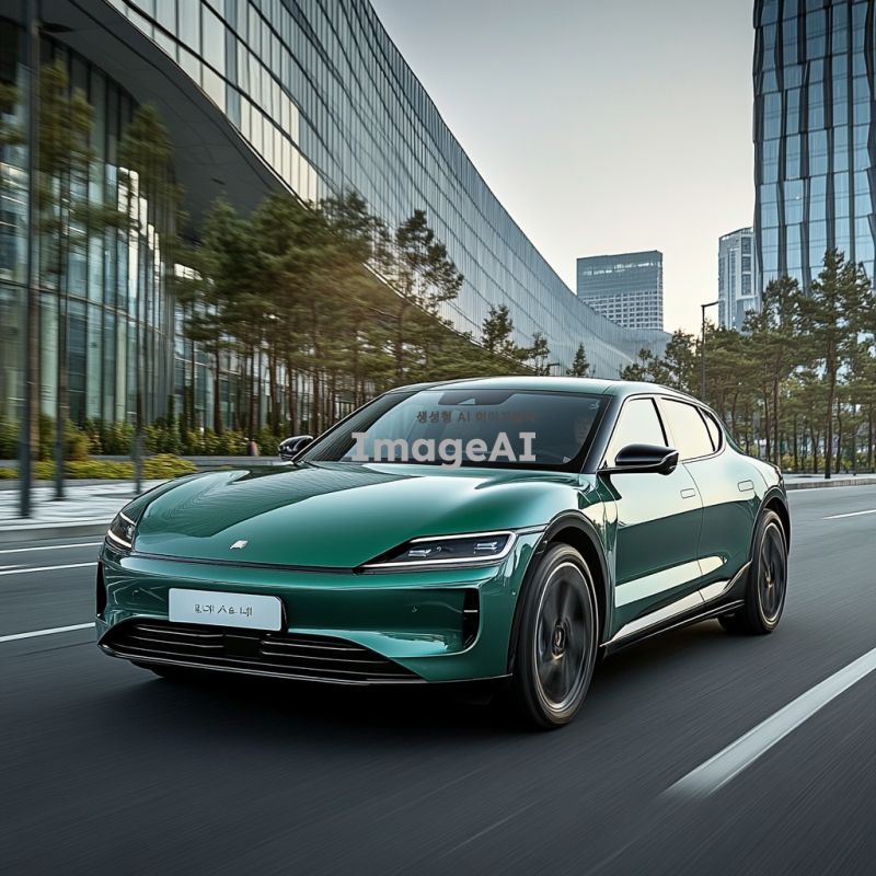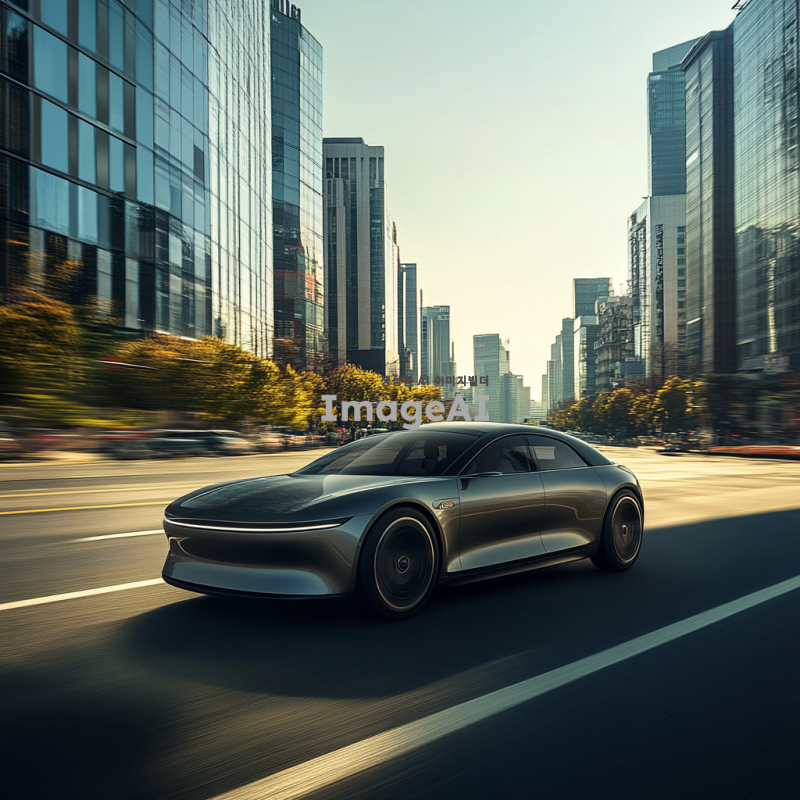 편리하고 깔끔한 디자인의 현대적인 자동차, 부드러운 곡선과 세련된 라인, 실용적인 내부 공간, 고급스러운 소재로 마감된 인테리어, 도시 배경에서 주행 중인 모습, 자연광이 비치는 상황, 한국의 현대적인 거리 풍경.