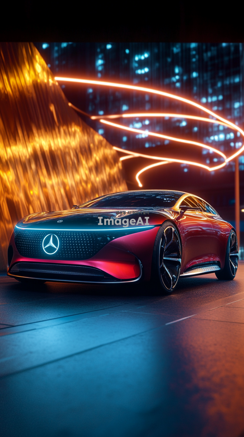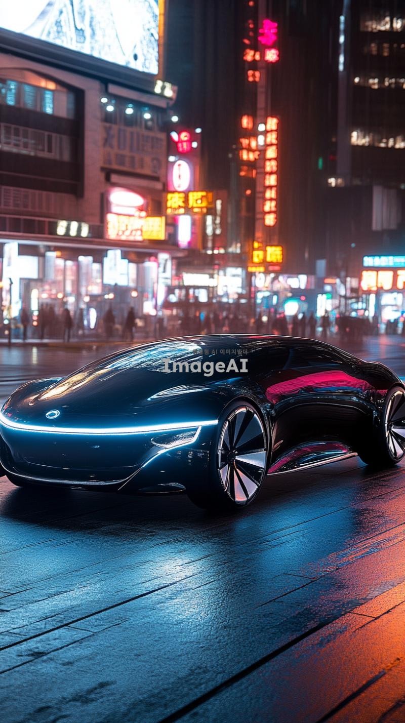 최고급 빛나는 하이브리드 자동차가 여러 색이 섞여 있는 모습, 세련된 디자인과 미래적인 요소가 강조된 외관, 도시의 배경에서 빛나는 조명 아래 주행하는 장면, 고급스러운 느낌을 주는 세부 묘사, 화려한 색상이 조화를 이루며 시선을 사로잡는 이미지.