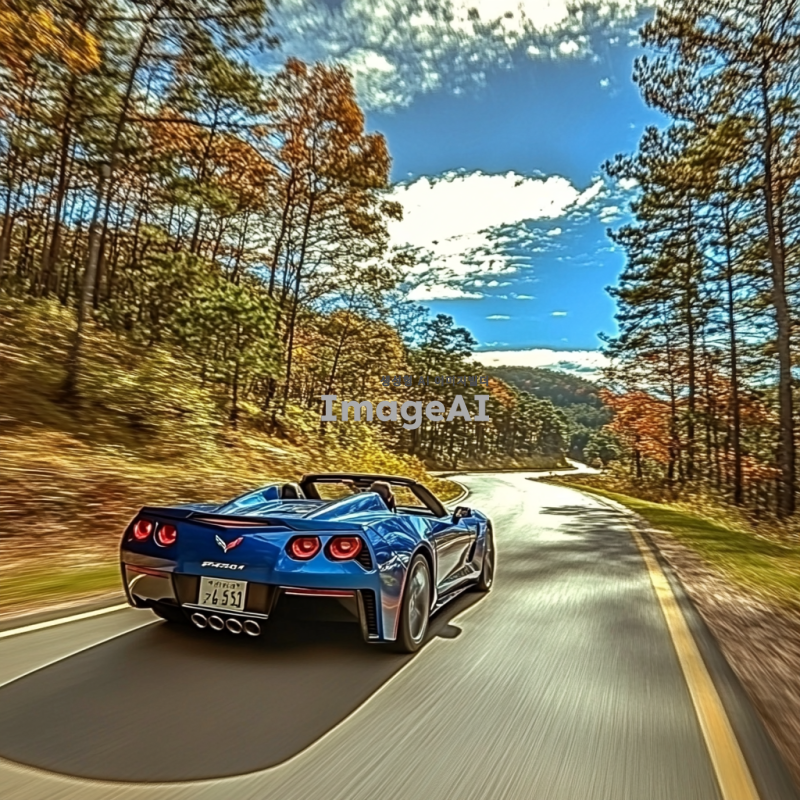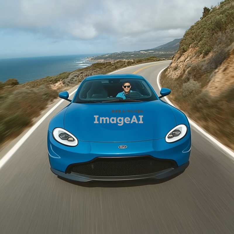 파란색 스포츠카가 도로를 질주하는 모습, 햇살이 비치는 날, 아름다운 자연 경관 배경, 드라마틱한 각도에서 촬영된 이미지, 현대적이고 세련된 디자인의 차, 스포티한 느낌 강조, 한국인 남성이 운전하고 있는 모습, 즐거운 표정으로 바람을 느끼며 달리는 장면.