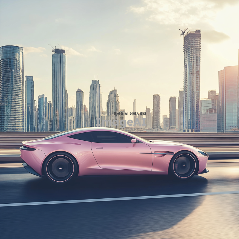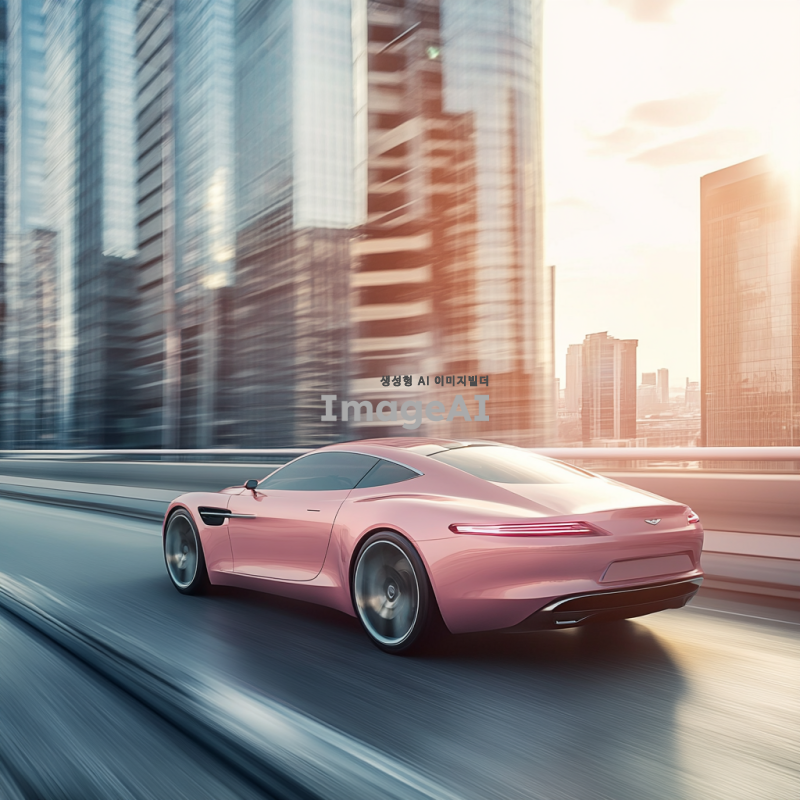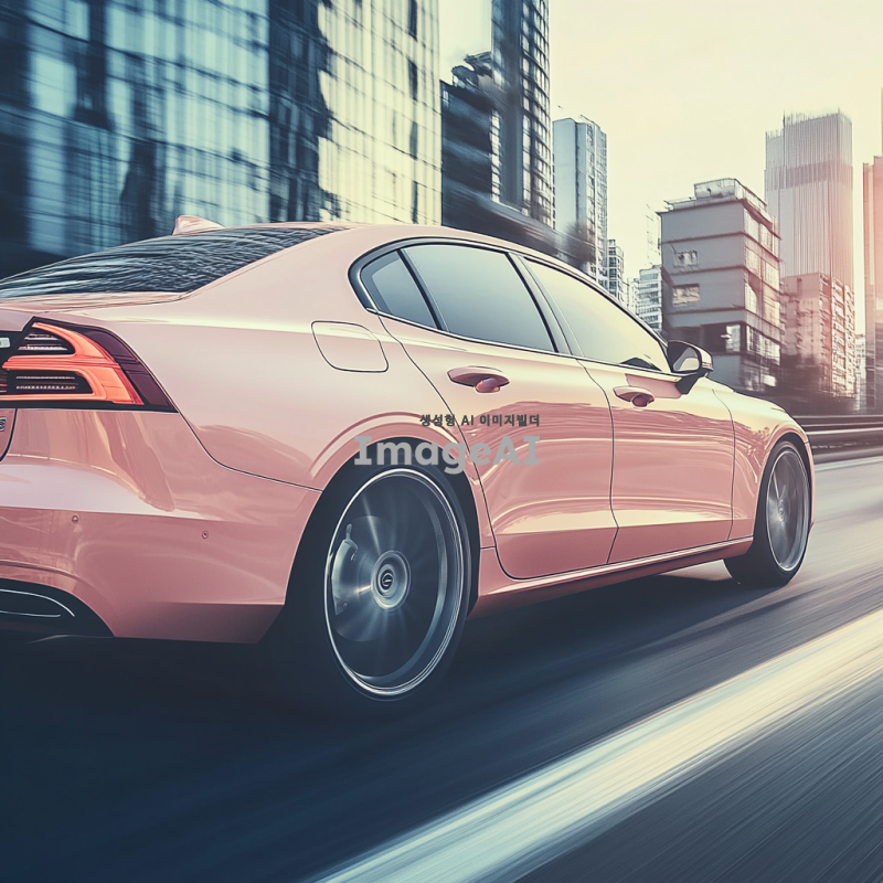 연한 핑크색의 세련된 디자인의 자동차가 도로를 주행하고 있는 모습, 부드러운 햇살 아래 반짝이는 차체, 현대적인 도시 배경, 고급스러운 느낌을 주는 이미지.