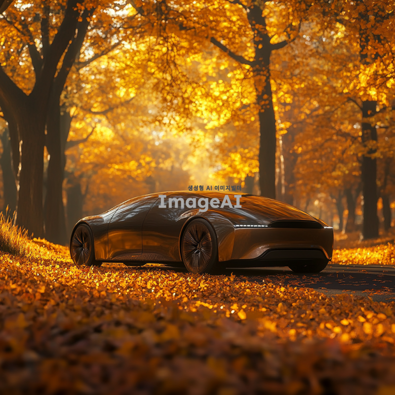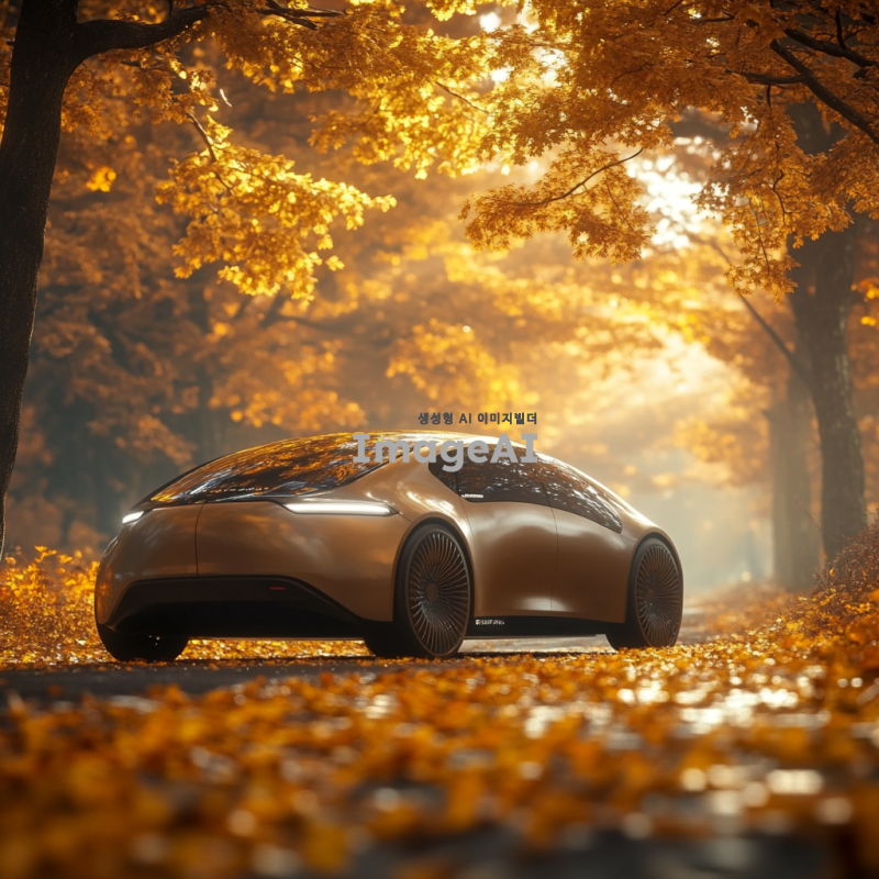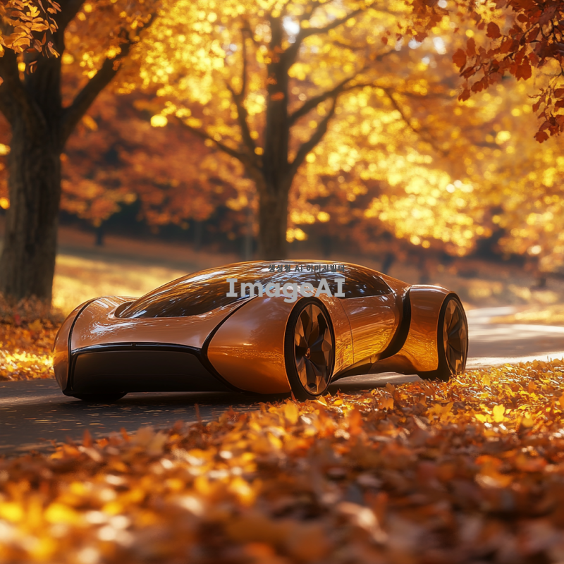 가을 느낌이 나는 브라운색의 깔끔한 디자인의 자율 주행 자동차가 고요한 도로를 주행하고 있는 모습. 주변에는 노란색과 주황색의 단풍이 떨어져 있고, 따뜻한 햇살이 비추는 풍경. 자동차는 현대적이고 미래지향적인 스타일로, 자연과 조화를 이루며 주행하는 모습.
