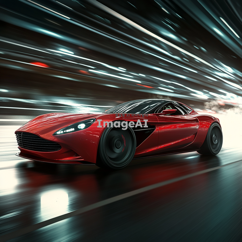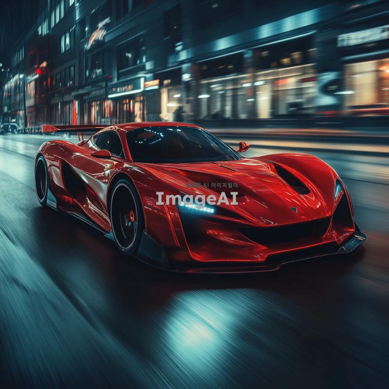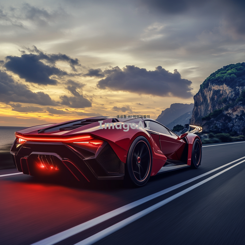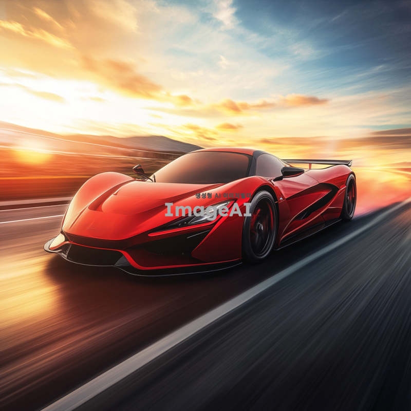 빠른 속도를 자랑하는 빨간색 부스터가 장착된 국산 슈퍼 자동차, 매끄러운 디자인과 역동적인 자세, 도로를 질주하는 모습, 화려한 배경과 함께 역동적인 느낌을 강조한 이미지.