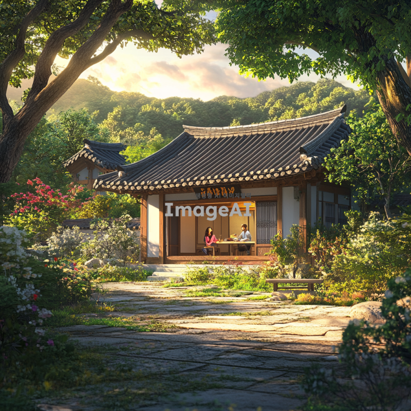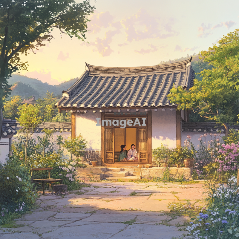 따뜻한 저녁 햇살이 비치는 한국의 전통 가옥 앞마당, 고요한 풍경 속에서 집으로 돌아가고 싶은 마음을 담아낸 모습. 집 안에서는 가족이 함께 웃고 있는 모습이 보이고, 주변에는 푸른 나무와 꽃들이 만발해 있는 따뜻하고 아늑한 분위기. 집 앞에 놓인 작은 벤치에 앉아 하늘을 바라보며 고향의 따뜻함을 느끼는 사람의 뒷모습.
