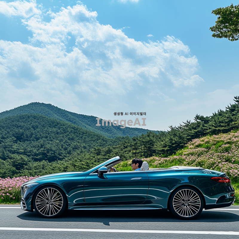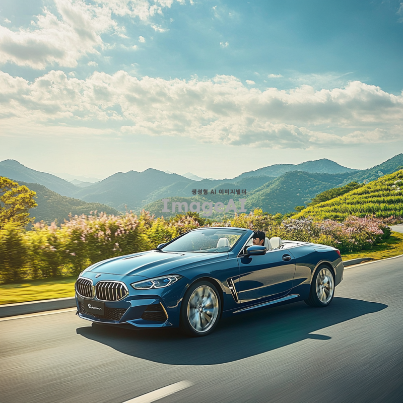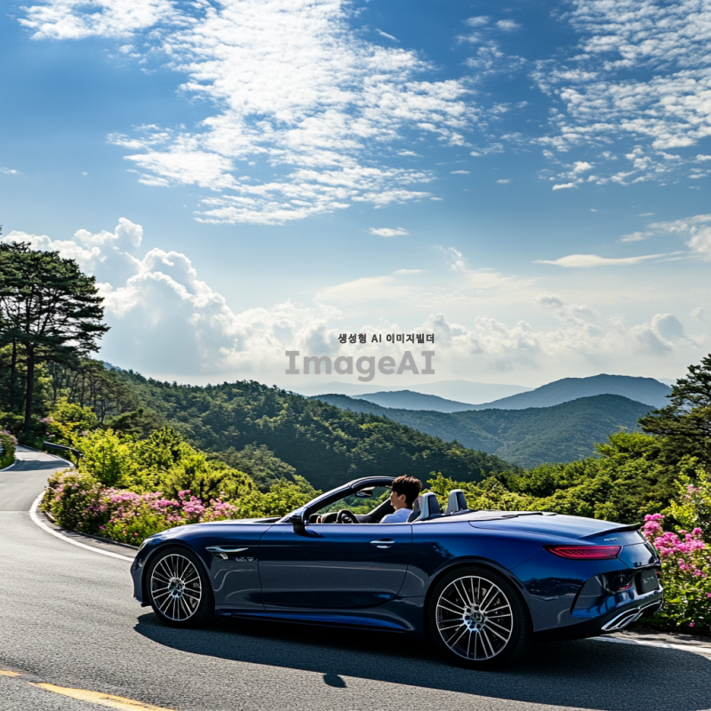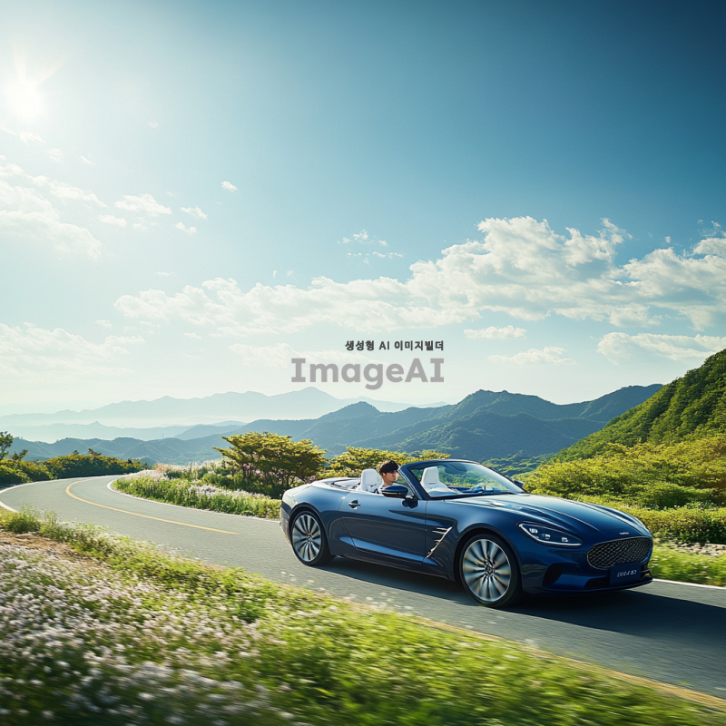 한국의 아름다운 풍경 속에서 주행 중인 세련된 오픈카, 화창한 날씨, 푸른 하늘과 흰 구름, 차량의 반사광이 빛나는 모습, 고급스러운 디자인과 매끄러운 곡선, 드라이버는 한국인 남성, 편안한 표정으로 도로를 바라보는 모습, 자동차의 색상은 메탈릭 블루, 주변에는 푸른 나무와 꽃들이 만발한 자연 경관.