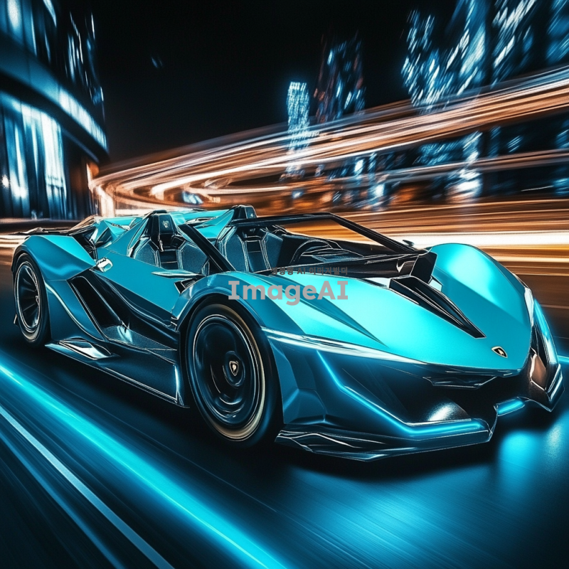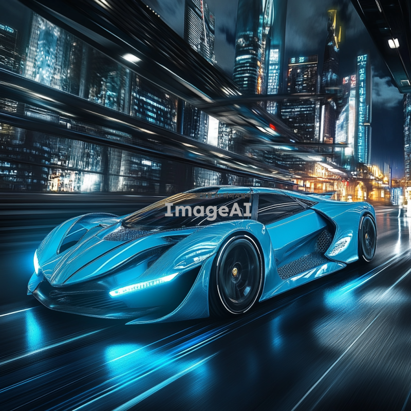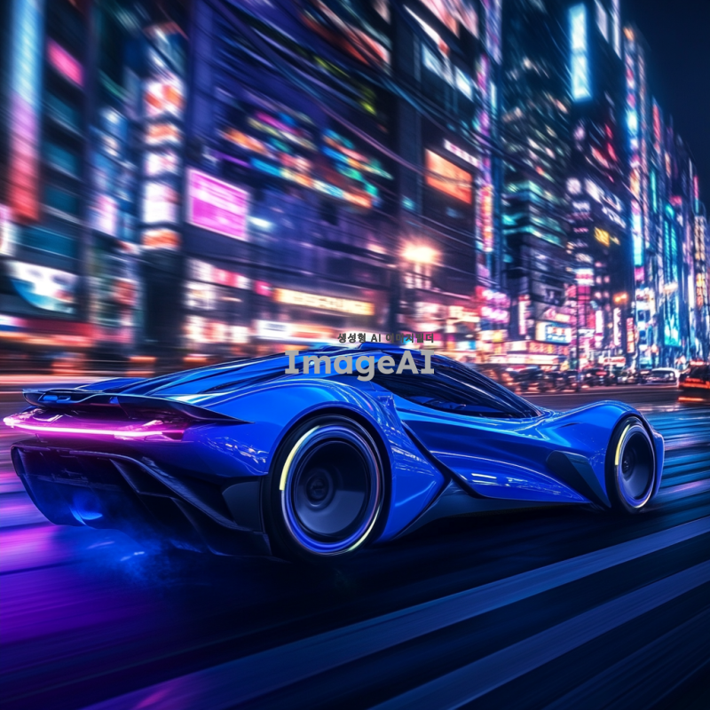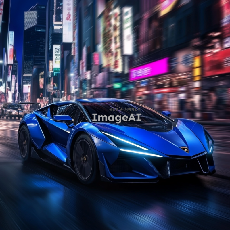 25살 한국인이 타고 있는 파란색 스포츠카, 속도감이 느껴지는 디자인, 자율주행 기능이 있는 차량, 람보르기니 스타일의 세련된 외관, 현대적이고 미래지향적인 배경, 역동적인 주행 장면.