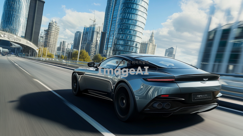 미래 도시의 도로를 주행하는 성능 좋고 깔끔한 자율주행 자동차, 현대적인 디자인과 세련된 외관, 주변의 고층 빌딩과 푸른 하늘, 차선이 뚜렷하게 보이는 도로, 자동차의 내부는 최신 기술로 가득 차 있으며, 편안한 좌석과 대형 스크린이 있는 모습.