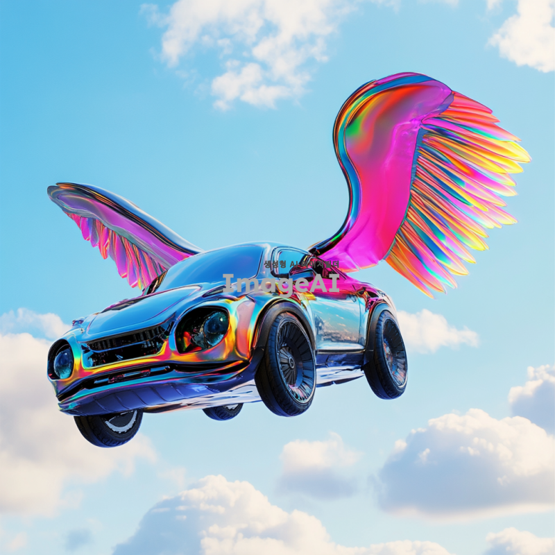 색깔이 화려하고 개성 있는 디자인의 대용량 모터를 장착한 날개가 있는 자동차, 다양한 색상의 조화로운 조합, 미래적인 느낌과 독창적인 형태, 공중을 나는 모습, 배경은 푸른 하늘과 구름, 자동차의 세부 사항이 잘 보이도록 클로즈업.