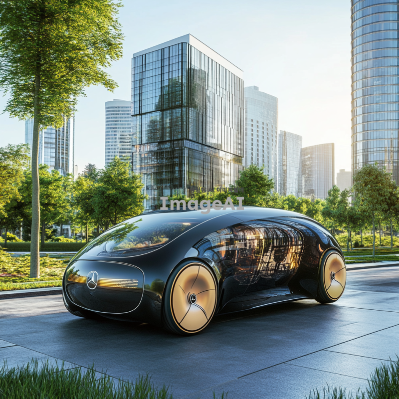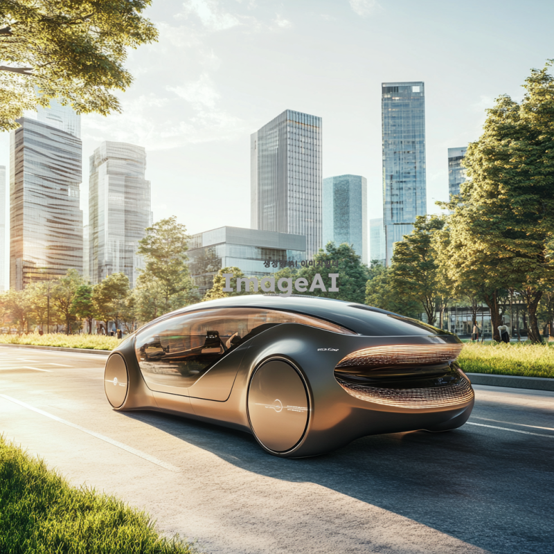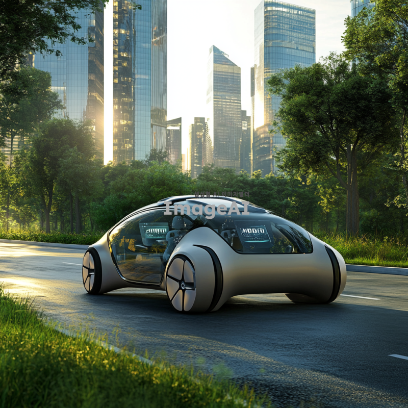 이쁘고 깔끔한 디자인의 자율주행 자동차가 도심의 현대적인 풍경 속에서 주행하고 있는 모습. 세련된 곡선과 미래적인 요소가 가미된 외관, 고급스러운 색상 조합, 그리고 자동차 주변에 도시의 고층 빌딩과 푸른 공원이 어우러진 장면. 햇살이 비추는 밝은 날씨 속에서 자동차가 부드럽게 도로를 달리는 모습.