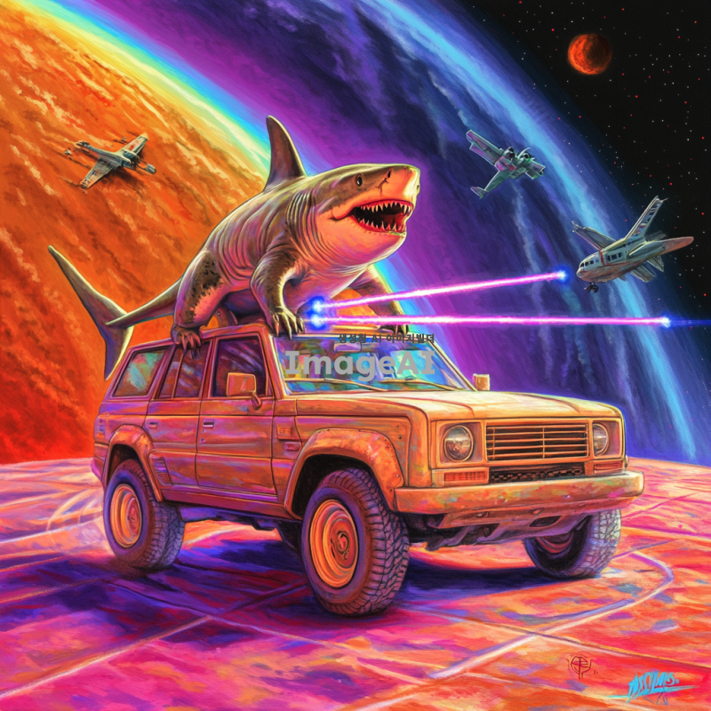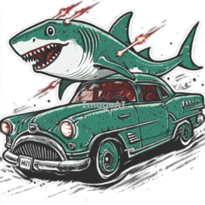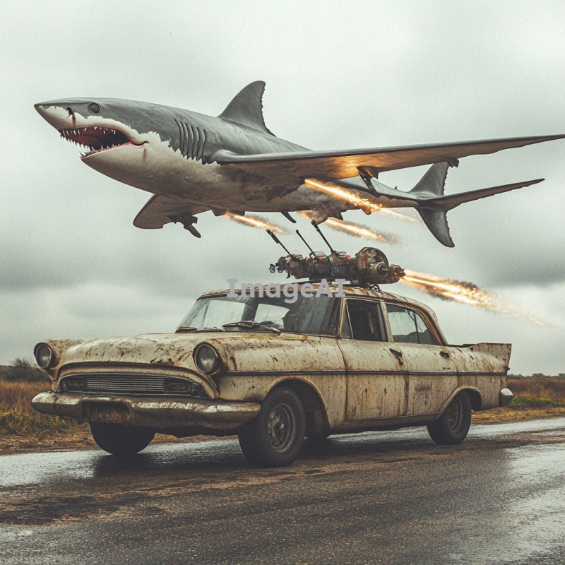 자동차위에 상어가있고 상어한텐 레이저 블래스트가 달려있음, 자동차는 바퀴대신에 공룡다리가 달려있음, 자동차엔 비행기 날개가 달려있음
