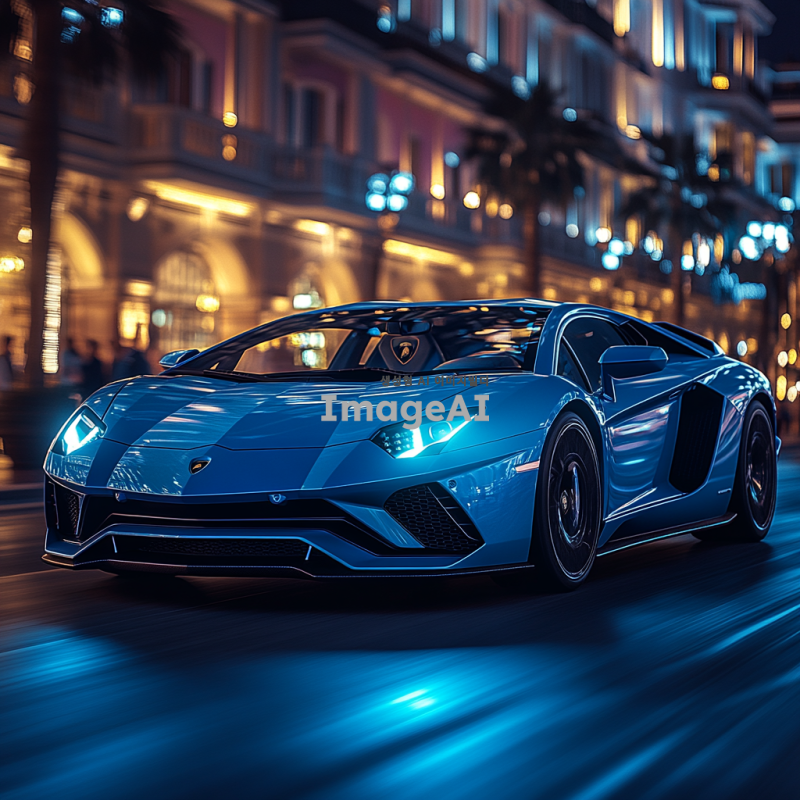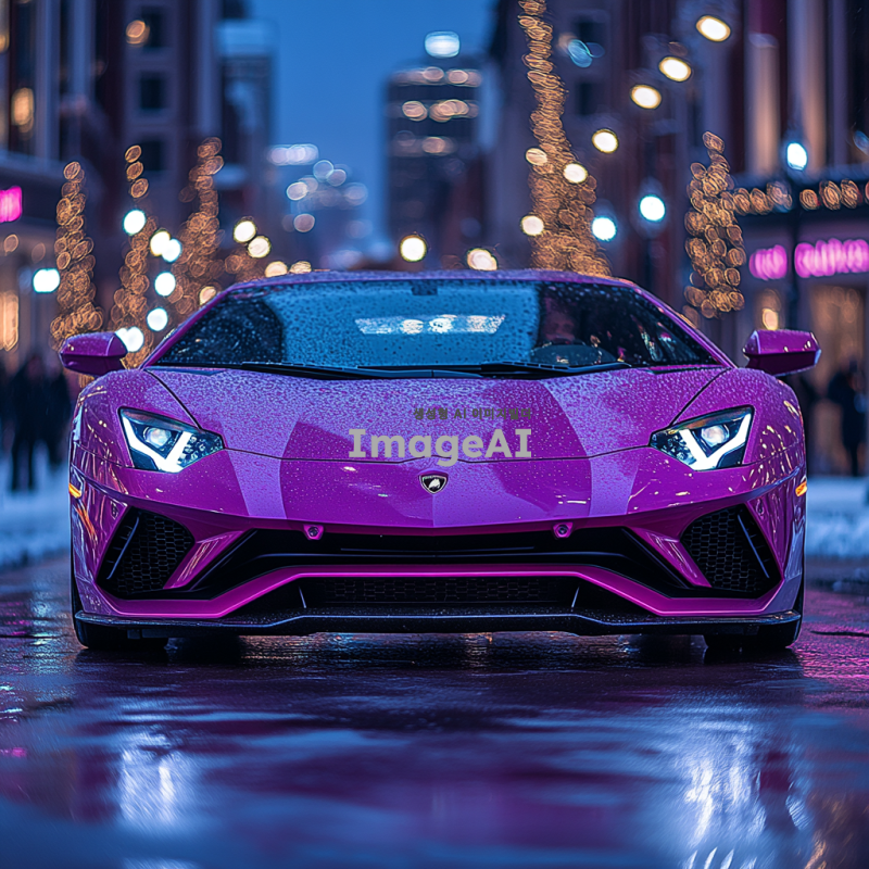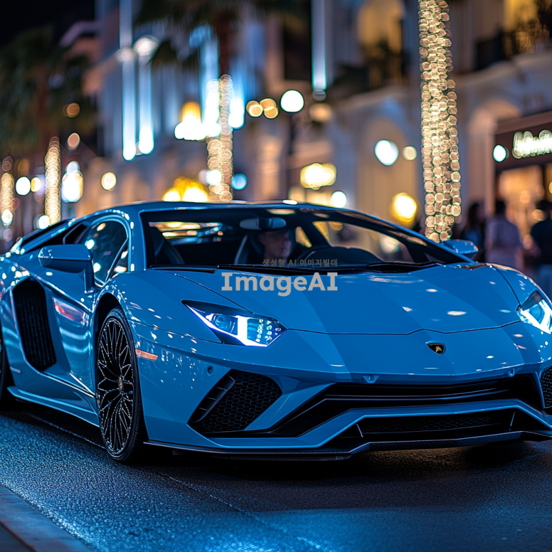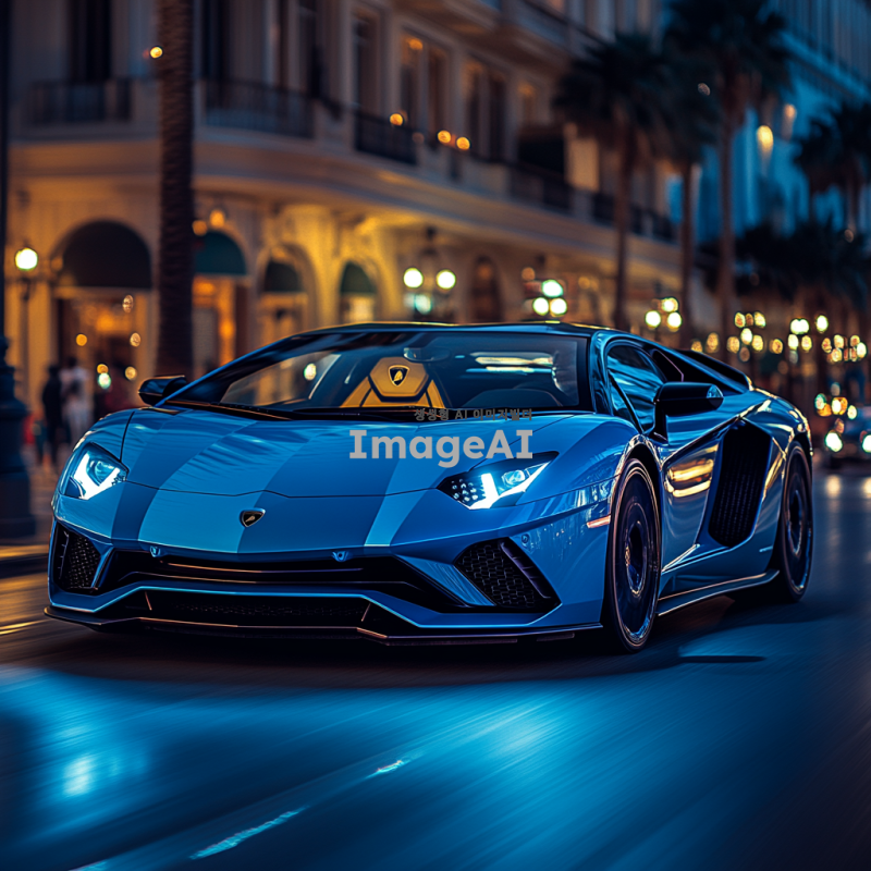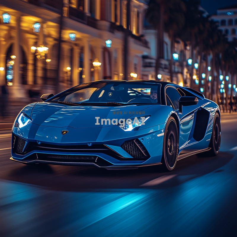 고급스러운 람보르기니 아벤타도르가 도심의 현대적인 거리에서 자율주행 모드로 주행하고 있는 모습. 차량은 세련된 디자인과 독특한 색상을 지니고 있으며, 주변에는 고층 건물과 도시의 불빛이 어우러져 있다. 차체의 반사광이 도로와 주변 환경을 비추고, 차량 내부에는 첨단 기술이 적용된 대시보드와 스크린이 보인다. 배경은 저녁 시간대의 화려한 도시 풍경으로, 사람들은 거리에서 여유롭게 걷고 있다.