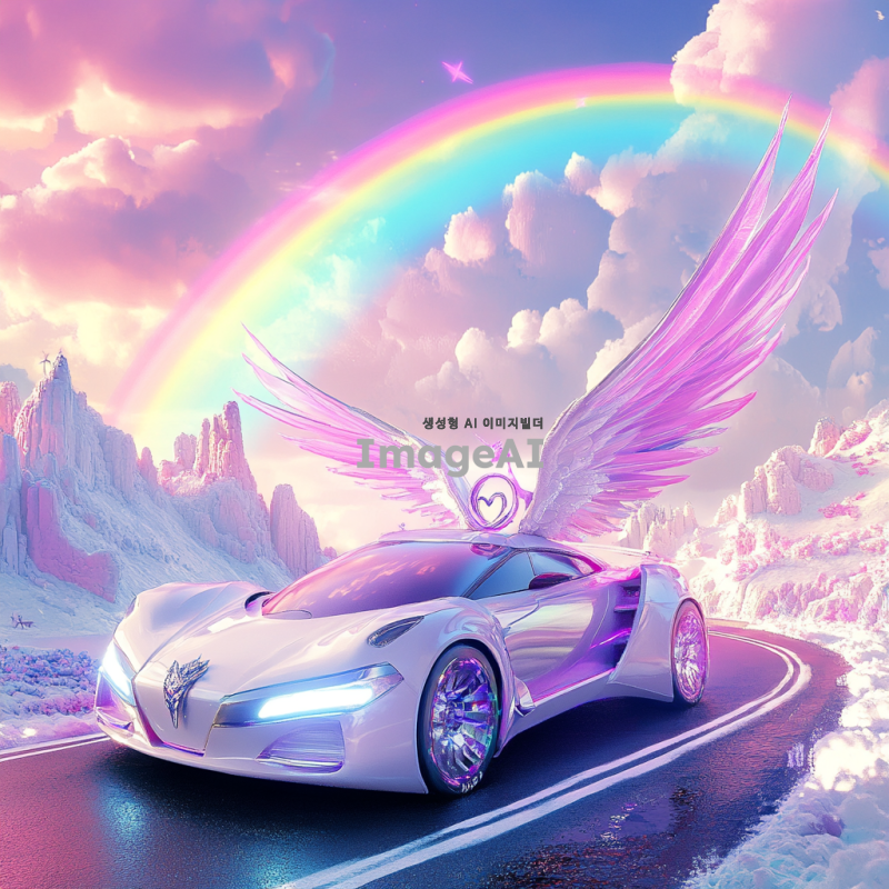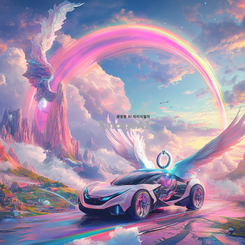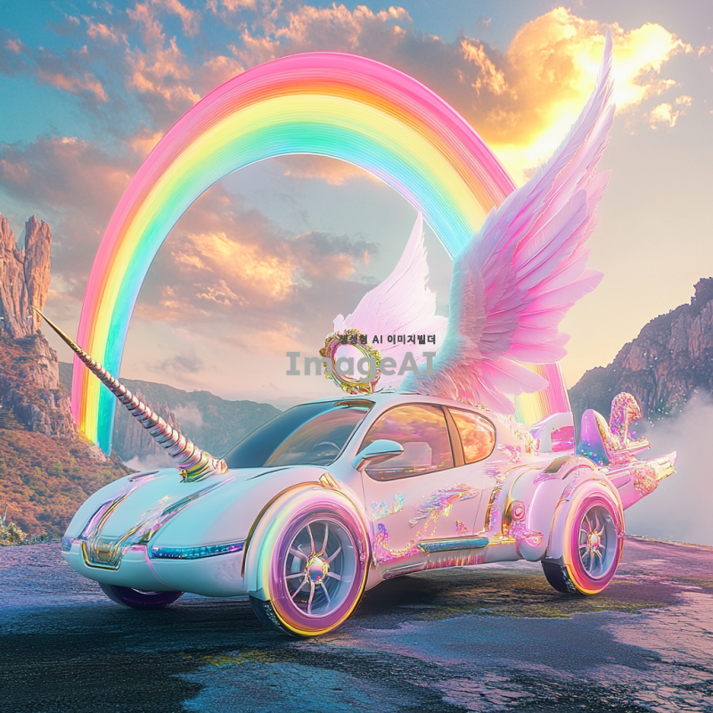 날개가 달리고 유니콘 뿔에 천사 링이 장착된 자율주행차가 뒤에서 화려한 무지개가 나오는 모습, 환상적인 배경, 몽환적인 분위기, 밝고 다채로운 색상, 미래적인 디자인, 한국의 풍경이 어우러진 장면