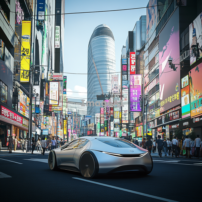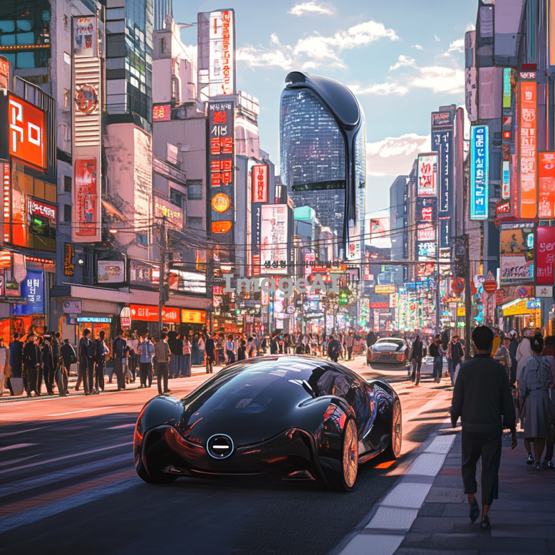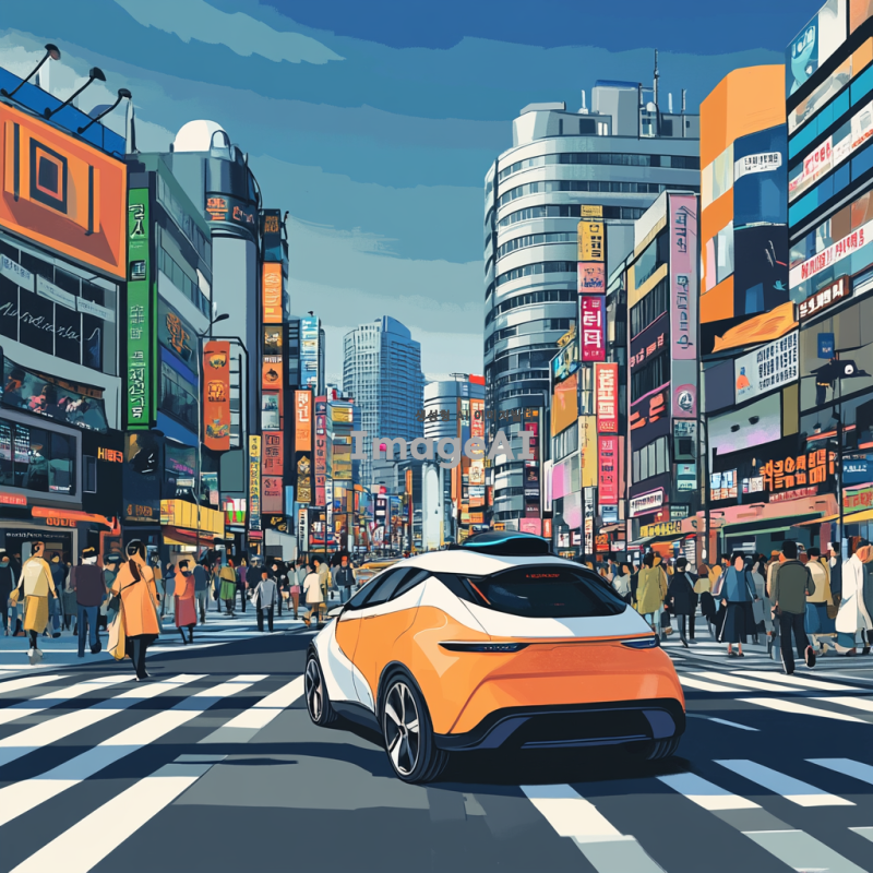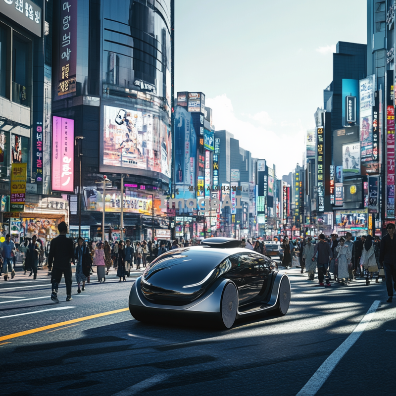 한국의 현대적인 도시 배경에서 자율주행 자동차가 도로를 따라 주행하고 있는 장면, 자동차는 세련된 디자인으로 미래적인 느낌을 주며, 주변에는 다양한 사람들이 걷고 있는 모습, 고층 건물과 네온사인이 어우러진 풍경, 맑은 하늘과 따뜻한 햇살이 비치는 날씨, 전체적으로 혁신적이고 기술적인 분위기를 강조한 이미지.